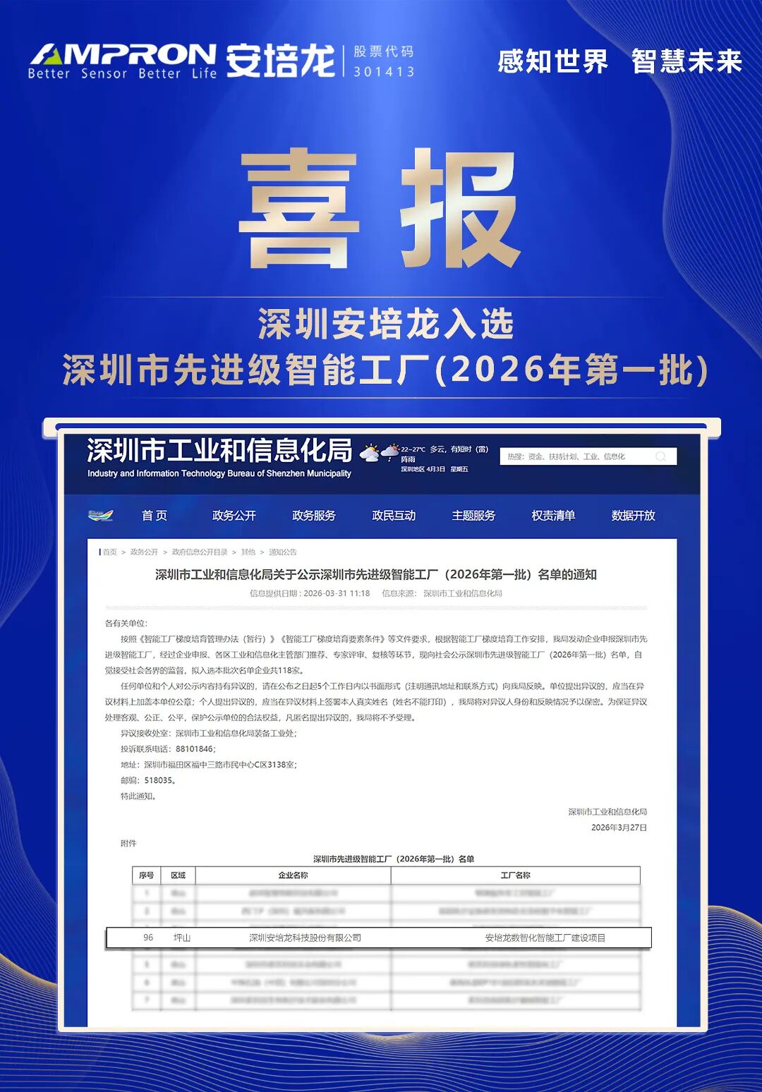 近日,深圳市工业和信息化局正式公布“深圳市先进级智能工厂(2026年第一批)”认定结果。深圳安培龙科技股份有限公司成功入选 “深圳市先进级智能工厂”。此次认定不仅是对安培龙智能制造领域建设成果的权威认可,也标志着公司在数字化协同发展取得了实质性突破。“先进级智能工厂”的评定标准严格,核心目标是提升企业的数字化网络化集成能力。具体要求包括:面向智能制造典型场景,广泛部署智能装备、工业软件及系统,实现