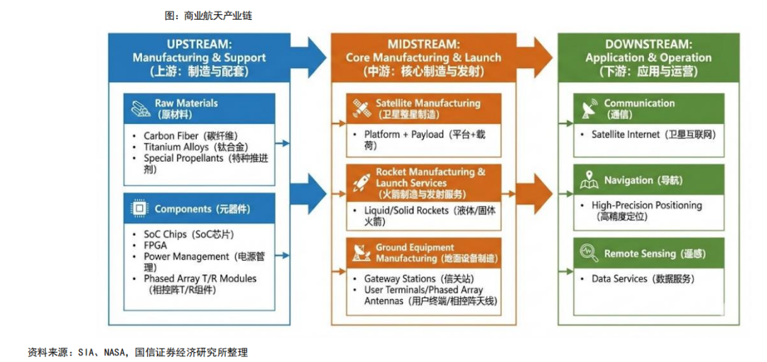 关注公众号,点击公众号主页右上角“ · · · ”,设置星标,实时关注前沿装备汇最新资讯本文将对商业航天定义、商业航天发展历史与关键节点、产业链分析、竞争格局与产业趋势、中国火箭产业链相关上市公司、中国卫星产业链相关上市公司等进行梳理,以供参考。一、商业航天定义传统航天:通常指由政府主导(如NASA、中国航天科技集团CASC)、主要服务于国家战略(国防、科研、国家声望)的航天活动。其特点是“高可靠