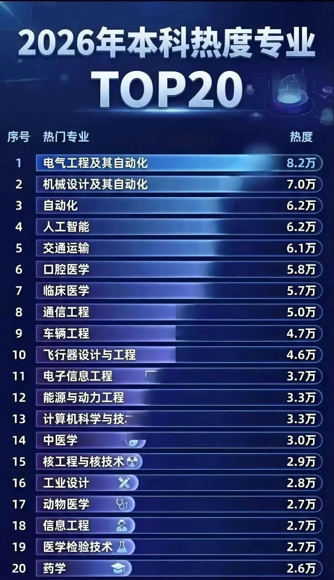 2026年高考志愿填报的大幕即将拉开,本科热门专业TOP20榜单新鲜出炉,这份榜单不仅是当下高考报考的核心风向标,更是未来十年职业发展趋势与国家经济发展方向的直观体现。与往年不同,昔日的热门专业“霸主”计算机科学与技术意外跌出前十,电气工程及其自动化以8.2万的断层热度强势登顶,专业热度的剧烈变化背后,藏着时代发展的新趋势,也为考生和家长的专业选择提供了关键参考。以下这份深度解析,将从榜单详情、热