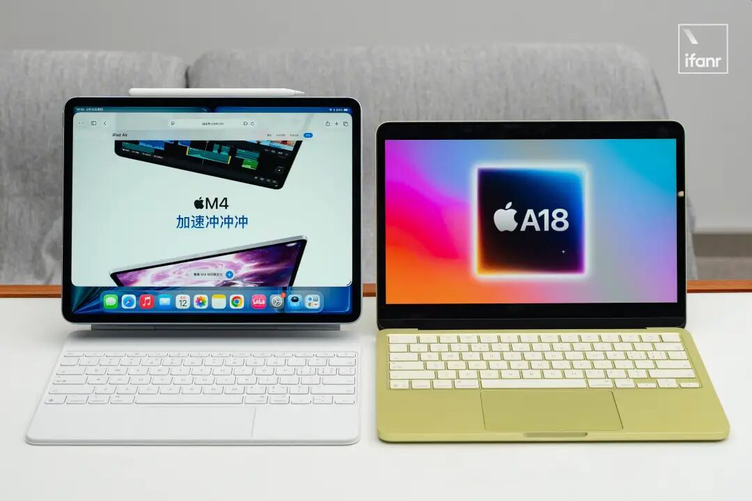 你觉得,我该买 M4 iPad Air,还是买刚出的 MacBook Neo?决定写这篇文章之前,大学同学把这个问题抛给我,我的第一反应是错愕的。放在以往,iPad 是 iPad,MacBook 是 MacBook,井水不犯河水。设备形态、交互方式、能力边界都不论,单看价位区间就难以将 iPad 和 MacBook 放在同一起跑线上。更何况苹果声嘶力竭地叫嚣「你的下一台电脑何必是电脑」,已经好几年了。然而营销的归营销,事实很清楚:真正能搞定工作的「生产力」,依然只存在于桌面级的 macOS 里。于是,iPad 更像是一个称职的「配角」,待在比 Mac 更低的价位段里,去填补那些关于触控、书写与创意的空白。然而今年,将这两款设备摆在一起讨论,突然变得极具现实意义。莫非 iPad 终于进化出了堪比 Mac 的生产力?并没有……只是 MacBook Neo 的定价,破天荒地杀入了 iPad Air 价格舒适区。主打轻薄移动的 iPad Air,迭代搭载了 Mac 同款的 M4 桌面级芯片;但真正运行着 macOS 的 MacBook Neo,却用上了一颗由 iPhone 16 Pro 首发的 A18 Pro 移动端芯片。所以回到开头的问题:选 Mac 还是选 iPad?无论是 M4 之于 iPad Air,还是 A18 Pro之于 MacBook Neo,性能都够用;交互重点在「触控」选 iPad;「键鼠」选 MacBook Neo;买 iPad Air:前提是你的需求非常明确前置(必须画画、重度手写笔记,或已有主力电脑作为互补);MacBook Neo:如果你的预算有限且需求模糊(日常办公、上课、做 PPT),别犹豫直接入。放弃「既要还要」的执念,是对钱包最大的尊重。从参数表上看,iPad Air M4 的性能似乎对 MacBook Neo 构成了碾压之势。但实际上,在五千元以内这个价位段,两者的性能都出现了不同维度的「溢出」。尽管 iPad Air 的 M4 芯片并非 MacBook Air 上的「满血版」M4 芯片,在 CPU 和 GPU 核心数量上都有所减少,但把它塞进如此轻薄的机身内,依然是一头不折不扣的性能猛兽。在绝大多数平板应用场景里,M4 的算力都显得有些「杀鸡用牛刀」。配合高达 12GB 的统一内存,这套配置显然不是为了应对当下的需求,而是为了放眼未来。实际体验下来,iPad Air 优秀的屏幕素质和立体声扬声器,足以完美胜任玩游戏、看视频等一切娱乐需求。更重要的是,12GB 的统一内存赋予了它近乎桌面级的多任务并行能力。得益于全新的窗口化机制,即便同时开启多个应用,系统依然丝滑流畅,体感上进一步逼近了 MacBook Air 的体验。尤其是 iPad Air 依然搭载了 60Hz 的屏幕,这更是让 M4 芯片的图形性能显得绰绰有余甚至有点大材小用。从这个角度来看,这种当下略显过剩的性能余量,足以让它从容扛过未来好几代系统的大版本迭代,历久弥新。相比起 iPad Air 按步就班的换「芯」升级,用上智能手机芯片的 MacBook Neo 才是近期苹果最出人意料、最具战略意义的一步棋。Neo 并未搭载 MacBook 家族常用的 M 系列处理器,而是直接用上了 iPhone 16 Pro 首发搭载的 A18 Pro 处理器。爱范儿认为,这也是苹果在 A 芯片耕耘超过 15 年,以及 ARM Mac 布局 6 年后水到渠成的结果。只不过,Neo 所搭载的也并非「满血版」A18 Pro,而是 6 CPU 核心 + 5 GPU 核心的配置,比「满血版」少了一颗 GPU 核心。即便如此,从 GeekBench 跑分来看,这颗 A18 Pro 的综合性能稳稳地卡在了 M1 和 M2 之间。虽然 M1 已经是 6 年前的芯片,但时至今日,M1 轻度办公体验依旧相当能打,编辑部依然有不少编辑还在主力使用 M1 MacBook Air 工作。所以说,一颗比 M1 芯片更强的 A18 Pro 芯片,确实有了流畅运行 macOS 的底气。更重要的是,MacBook Neo 搭载了与 MacBook Pro 毫无二致的完整版 macOS,在系统层面未作任何妥协。这恰恰印证了 MacBook Neo 纯正且完整的 Mac 属性。在实际体验中,它足以轻松拿捏所有常规的文字办公需求;而饱受吐槽的 8GB 统一内存,也并没有预想中那么捉襟见肘。无论是应用的快速冷启动,还是在几十个浏览器标签页之间反复横跳,它都表现得游刃有余。甚至用剪映拖拽 1080P 素材、剪辑一条几分钟的 Vlog,时间线操作也丝滑顺畅,毫无拖泥带水之感。只是客观来说这个 8GB 统一内存,必然没有 M4 iPad Air 那 12GB 统一内存来得那么宽裕与流畅,对我来说很容易就能摸清 MacBook Neo 的性能边界。同样也会有点担心,MacBook Neo 能不能撑过后续几年的系统版本更新。不过话说回来,那些更为严苛的「Pro 级」生产力需求,理应交由更高阶的 Pro 产品线去攻克,这本就不是「Neo」该操心的事。Neo 在「入门级」MacBook 这个角色里,确实做得相当好了。也许芯片决定了一台设备能跑多快,但系统决定了它能跑多远。自从 iPad 用上 Mac 同款的 M 系芯片之后,iPad 作为平板电脑和 Mac 电脑之间的差距,几乎就只剩下 macOS 了。我们之前的文章讨论过很多次 iPadOS,从人机交互的宏观视角来看,iPad 绝对是苹果过去 30 年科技树中最具野心、也最多样化的集大成者。比起不能触摸的 macOS 和不能用笔的 iOS,iPad 做到了「前可伸手点屏幕、中可提笔画批注、退可键鼠移窗口」。假设你身处大学图书馆,面对几百页晦涩的 PDF 英文文献时,你需要的是一支 Apple Pencil 随心所欲地高亮批注,是一根手指就能流畅翻页的直觉。对于考研党、医学生或是学术研究者来说,iPad 加上 Goodnotes,就是一座可以捧在手心里、随时随地可以被涂鸦的随身图书馆。这般独特的交互形态,对于画师、设计师等创意工作者而言,更是无可替代的生产力。然而,万物皆有代价。当一个电子产品的交互形态越是丰富,它在某一种特定工具上的极致体验就会