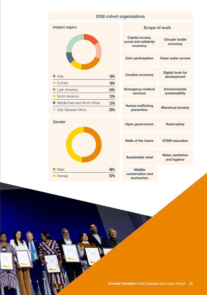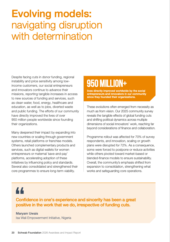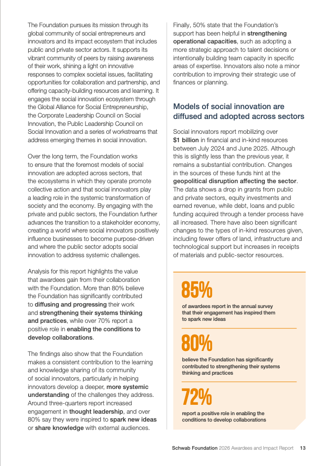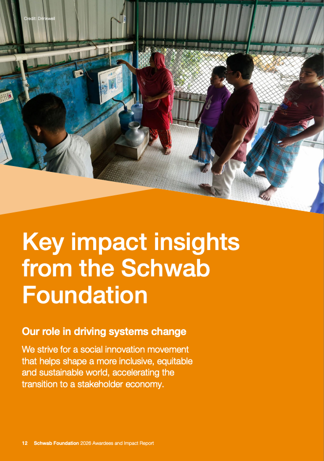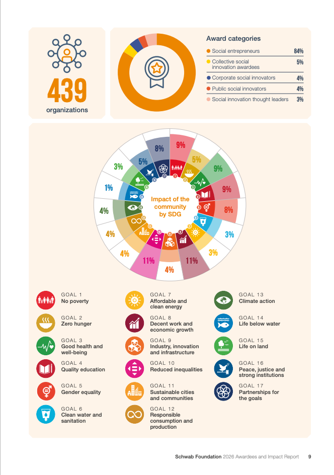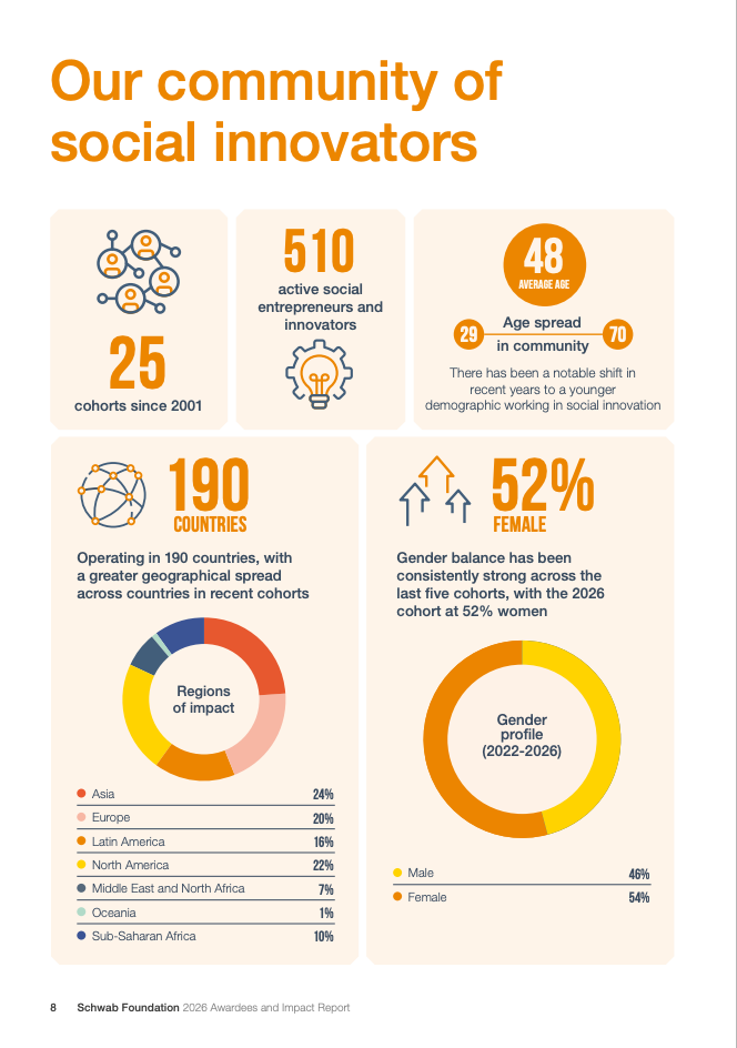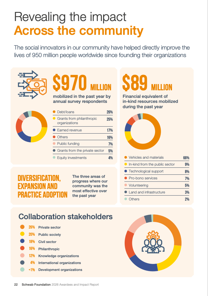 在全球经济震荡与资金收缩背景下,社会创新正从规模驱动转向韧性驱动,并逐步成为影响宏观经济与社会治理的重要力量。报告显示,施瓦布基金会已聚集510位社会创新者,覆盖190个国家,累计改善超过9.5亿人口生活,单年动员资源规模超过10亿美元,其中约9.7亿美元为资金投入,另有8900万美元等值实物资源。这一体量表明,社会创新已不再是补充性机制,而是具备系统性影响力的“准基础设施”。