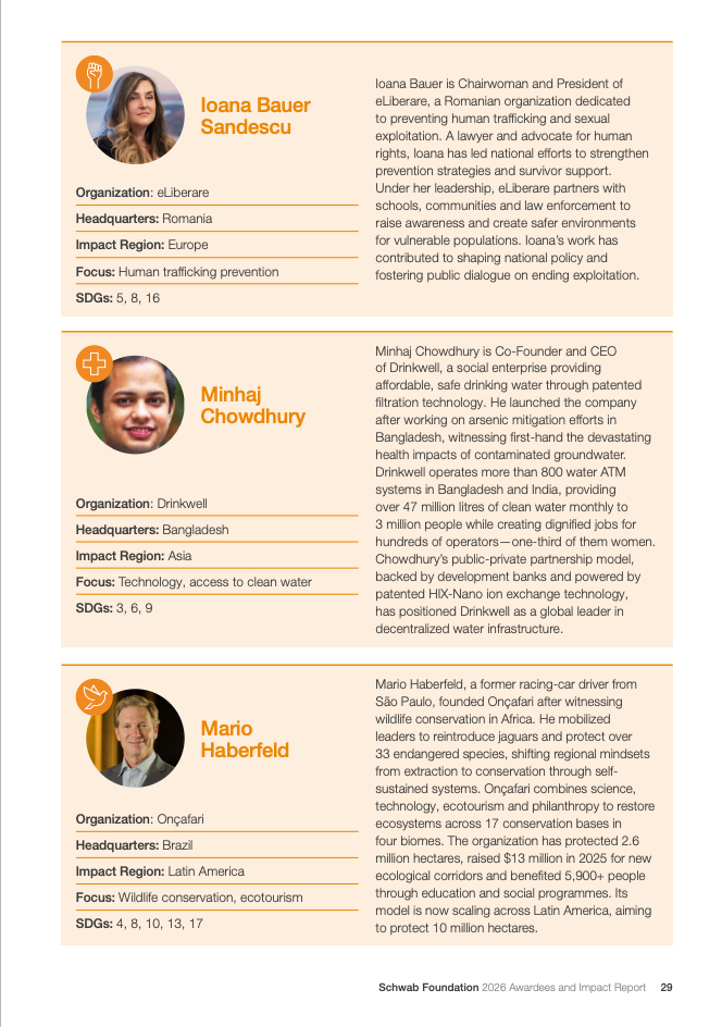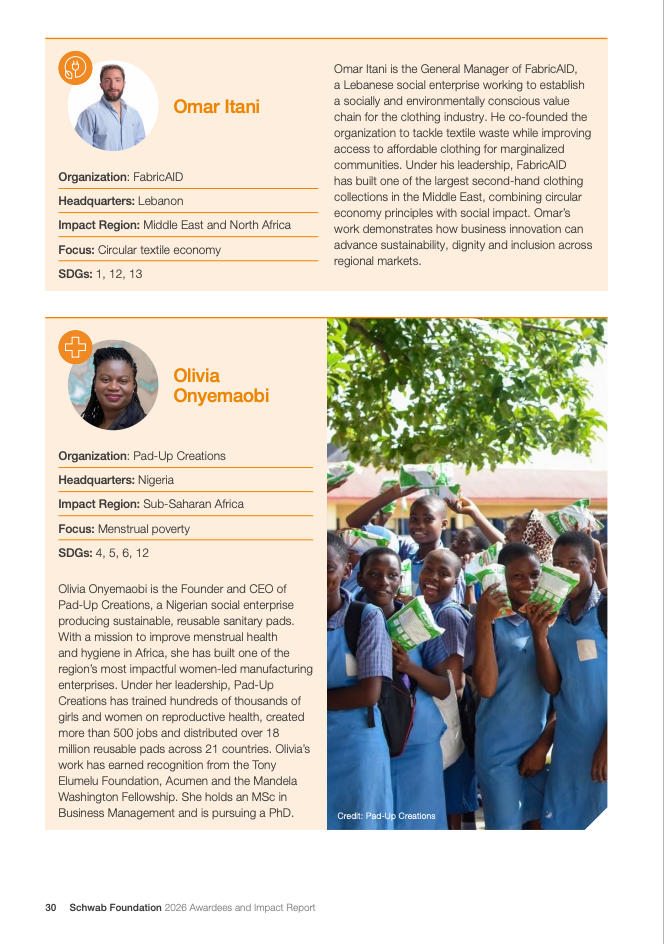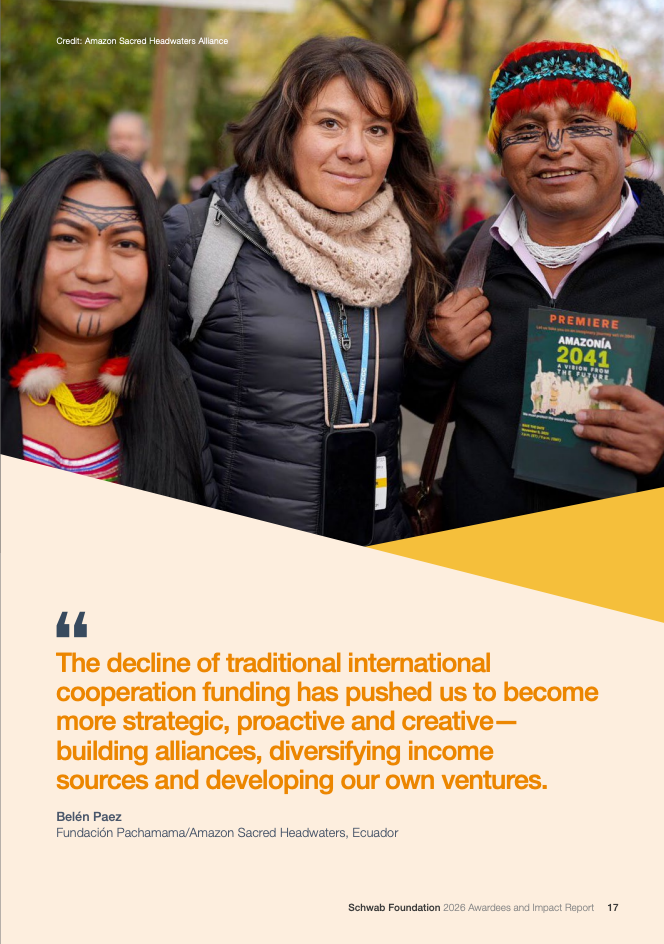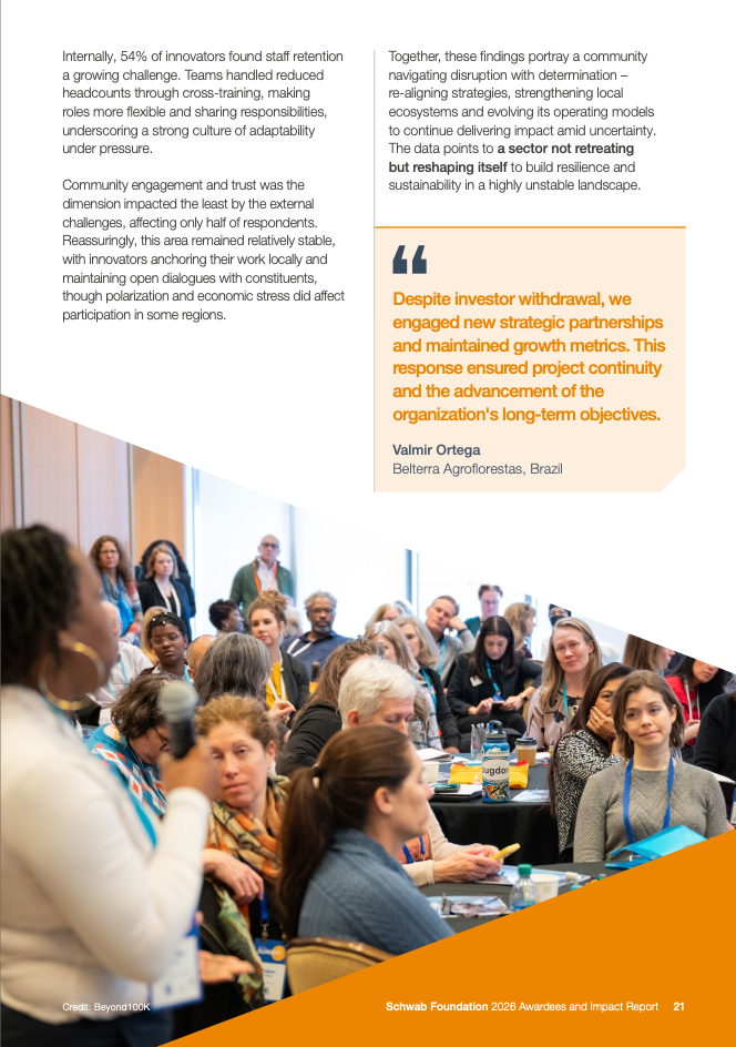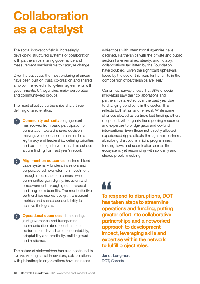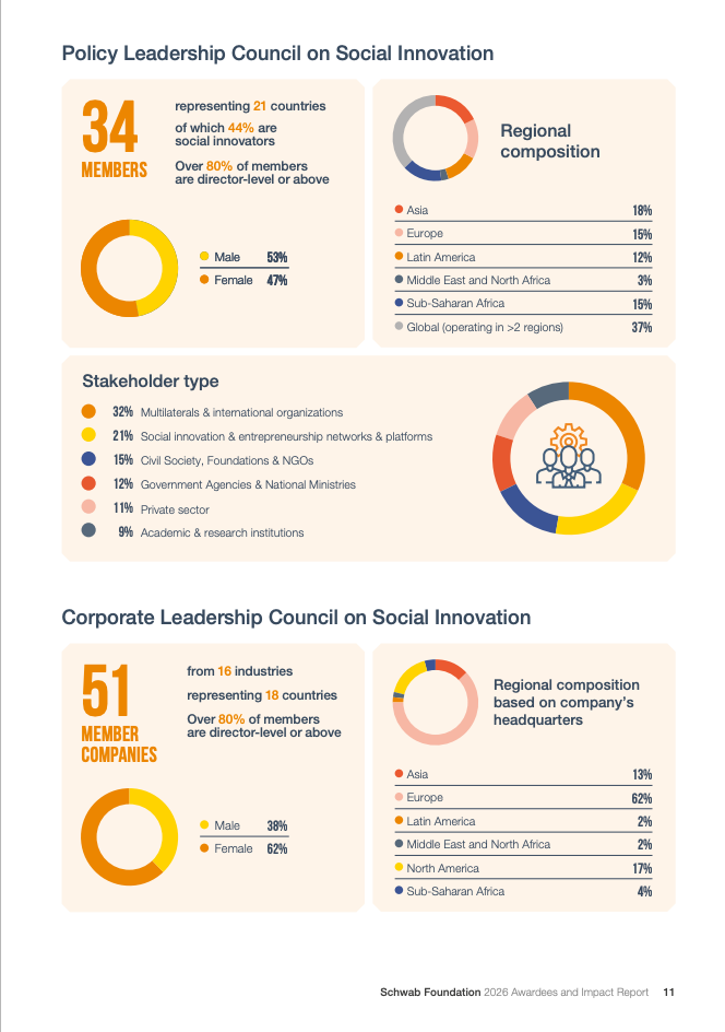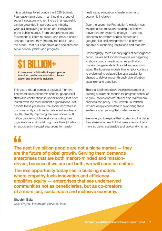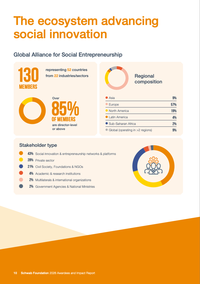 在全球经济震荡与资金收缩背景下,社会创新正从规模驱动转向韧性驱动,并逐步成为影响宏观经济与社会治理的重要力量。报告显示,施瓦布基金会已聚集510位社会创新者,覆盖190个国家,累计改善超过9.5亿人口生活,单年动员资源规模超过10亿美元,其中约9.7亿美元为资金投入,另有8900万美元等值实物资源。这一体量表明,社会创新已不再是补充性机制,而是具备系统性影响力的“准基础设施”。