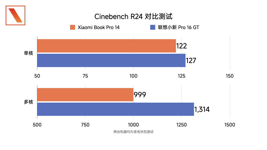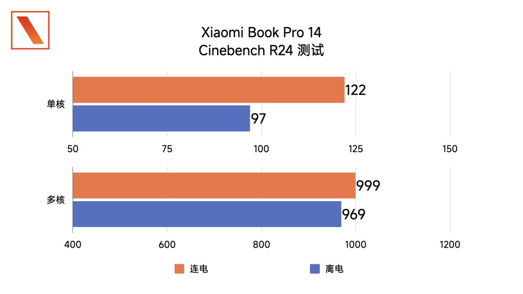 先看看跑分。Cinebench R24 测试,Xiaomi Book Pro 14 连电单核 122 分,多核 999 分;离电单核 97 分,多核 969 分。