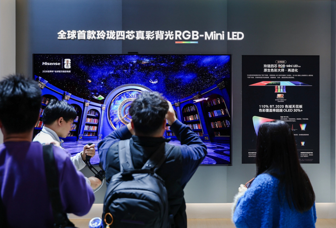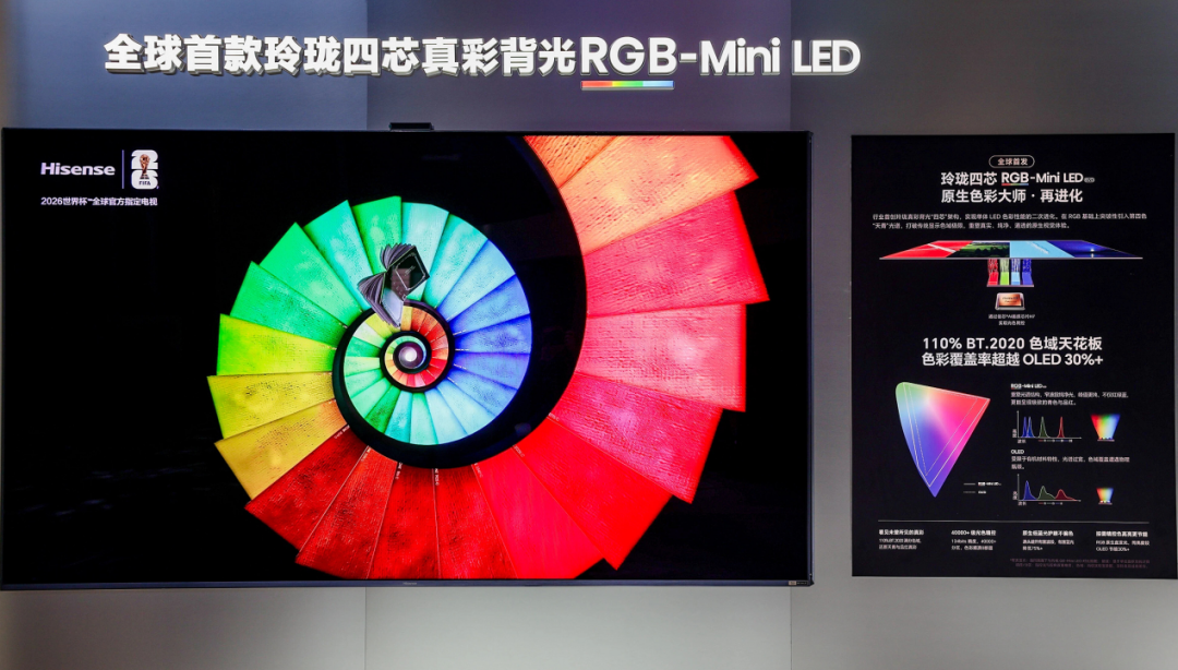 这项技术最大的特点是大色域、高色准——这从底层决定了它能够成为专业级显示设备。相较大家熟知的QD-Mini LED、SQD-Mini LED等传统液晶显示方案,RGB-Mini LED实现了代差级领先,也是全球公认的最新一代显示技术标杆。日系电视品牌在二十年前曾研究过这种彩色背光的显示技术,但受制于灯珠寿命、芯片算力等迟迟未能量产,直到2025年1月,海信在CES全球首发RGB-Mini LED技术。