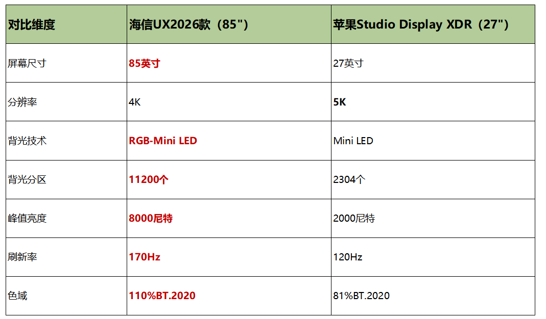 简单对比一下海信 UX2026款(85 英寸)和苹果 Studio Display XDR(27 英寸)的核心参数: