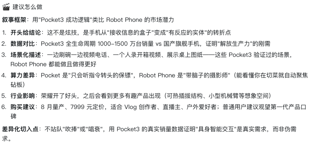 哪些话题正在变热,哪些角度已经被写过,哪些切入点还有空间,它都会给出对应的判断,甚至还会附上一个推荐分数,有的还会建议如何去写,如何进行差异化切入,开头怎么写,数据怎么对比,场景化怎么描述等等。