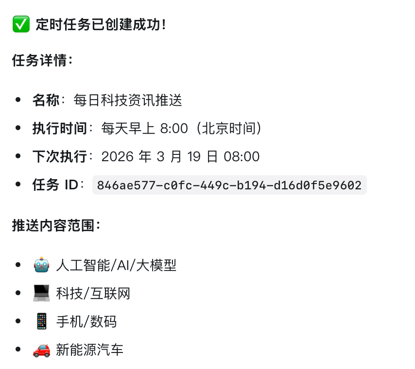 对于我们内容团队来说,每天刷新闻其实是一个刚需,而悟空可以直接设定时任务,比如每天固定时间推送某几个领域的资讯摘要,到时间就会自动发到钉钉上。这就像是聘请了一位助手,定时收集好行业信息,帮助我们快速捕捉热点。现在,主编可让它每天早晨干好活,将内容摆在桌面等他上班再查看;又或者等某某新品发布会结束,再让它去做内容的整体总结分析。