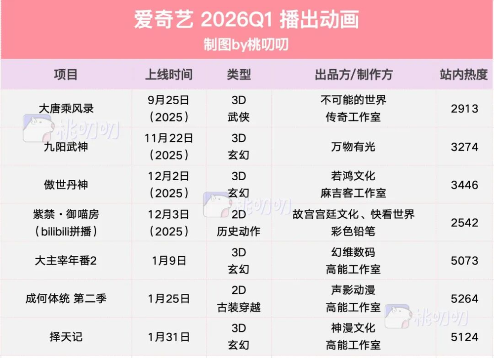 能与腾讯视频动漫一较高下的B站国创,去年底发布40+动漫项目,其中大IP不少,但今年采取田忌赛马策略徐徐图之,Q1亮点不算多: