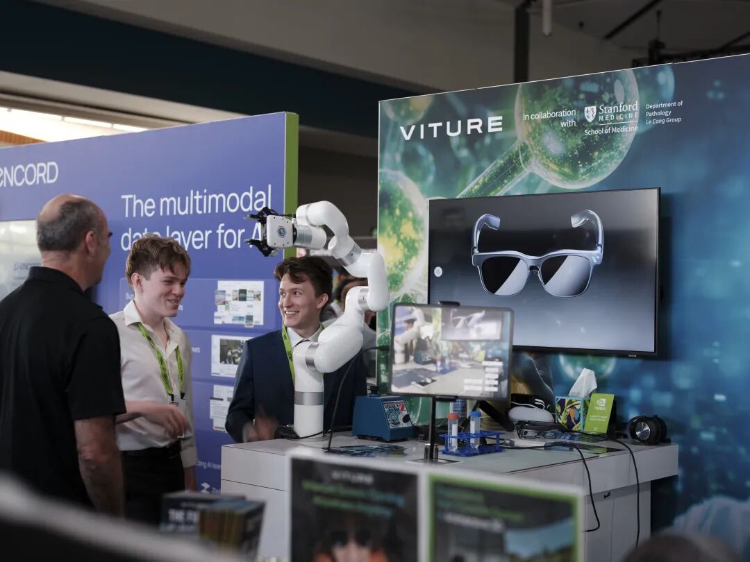 此次GTC大会现场中,VITURE展示了通过其基于VITURE Luma Ultra XR智能眼镜及VITURE Pro颈环的XR+AI Lab Automation实验室自动化解决方案,并与后台AI系统协同处理。