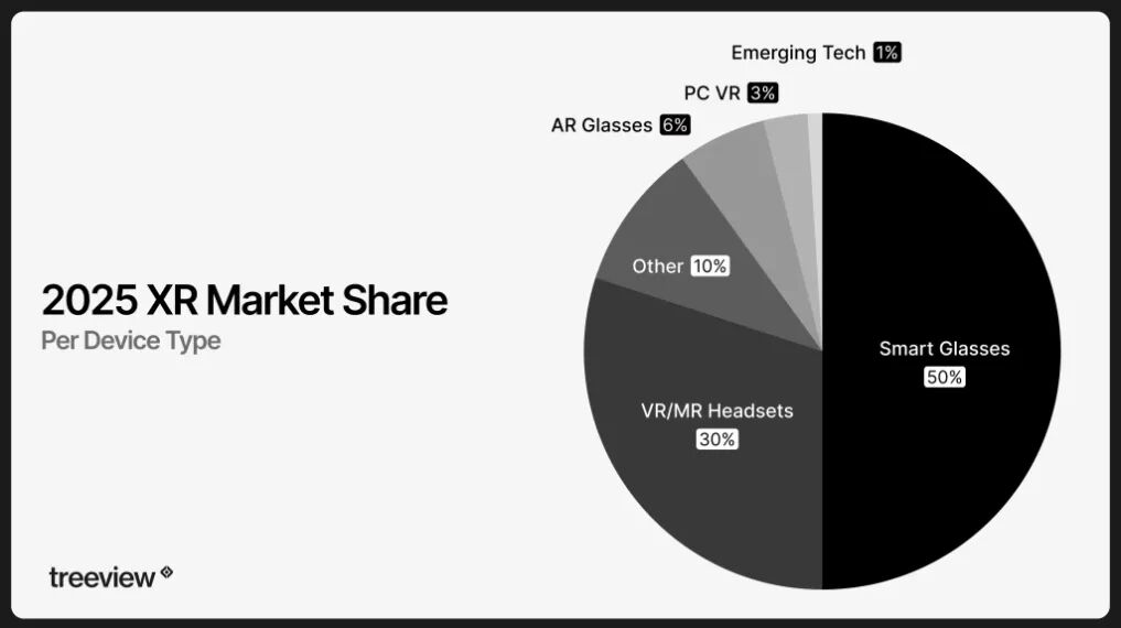 过去几年里,XR行业的增长结构正在发生明显变化。根据IDC报告预测,2025年全球XR设备出货量达到约1450万台,同比增长41.6%,但增长主要来自轻量化智能眼镜,而传统VR头显的市场增速明显放缓。更具体来看,智能眼镜在2025年首次占到全球XR设备出货量的约一半,相比2024年的约25%几乎翻倍。
