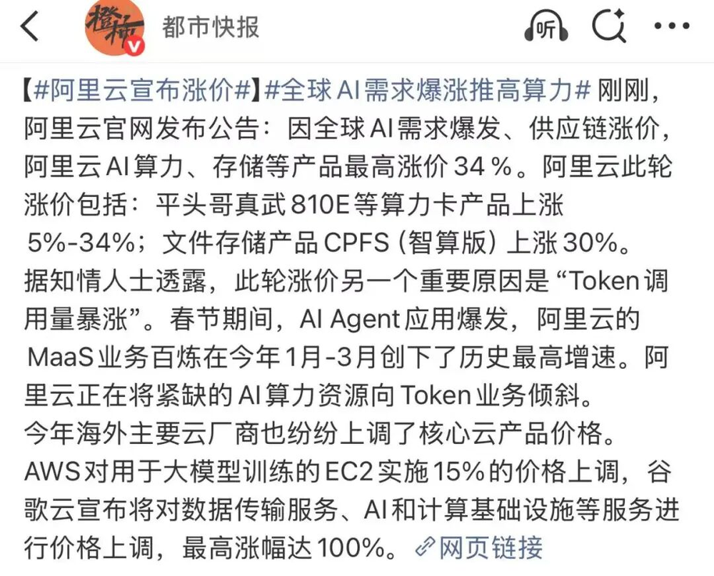 除了电子消费品厂商,阿里云、百度智能云、腾讯云等云服务商也已陆续宣布AI算力、存储等产品涨价,涨幅最高达34%。这意味着企业采购服务器、搭建数据中心、使用云服务的成本都在全面上升,最终这些成本将通过各类数字化服务转嫁给普通消费者。