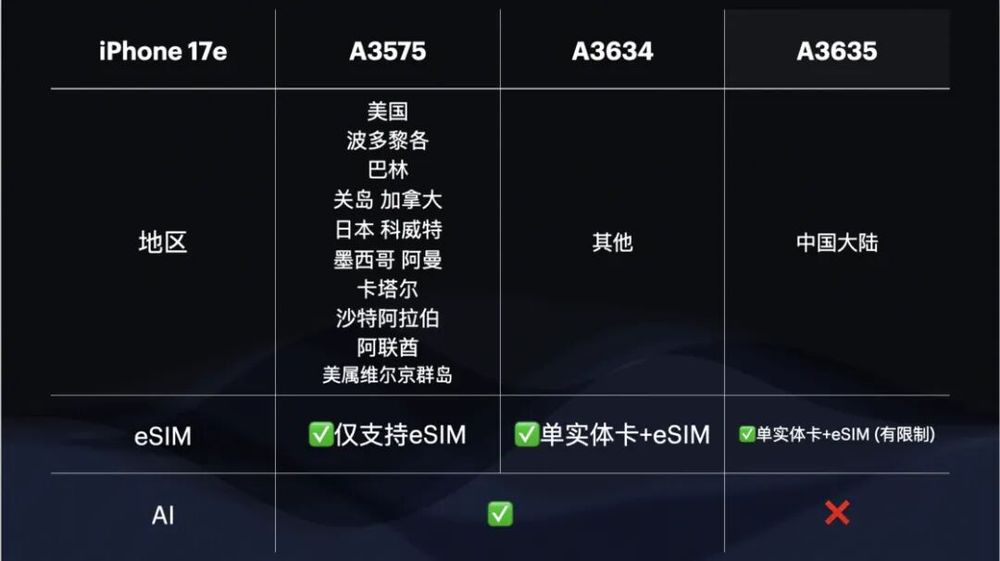 随后登场按时间顺序登场的是OPPO Find X9 Pro卫星通信版、HUAWEI Mate 80 RS和荣耀Magic 8 Pro Air,三款产品均配备了双实体SIM卡槽,但eSIM仅支持单待。iPhone 17e的国行版本采用单实体SIM卡槽加eSIM的设计,eSIM支持双待,型号A3635。