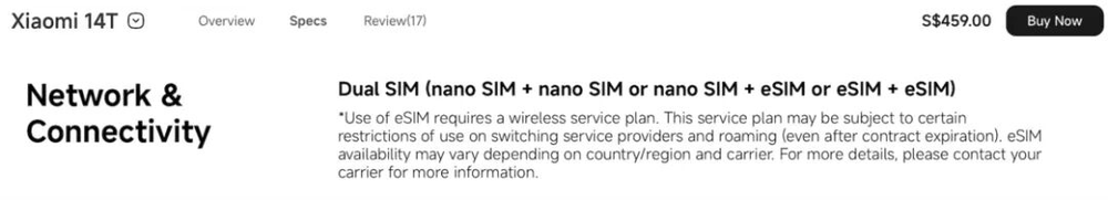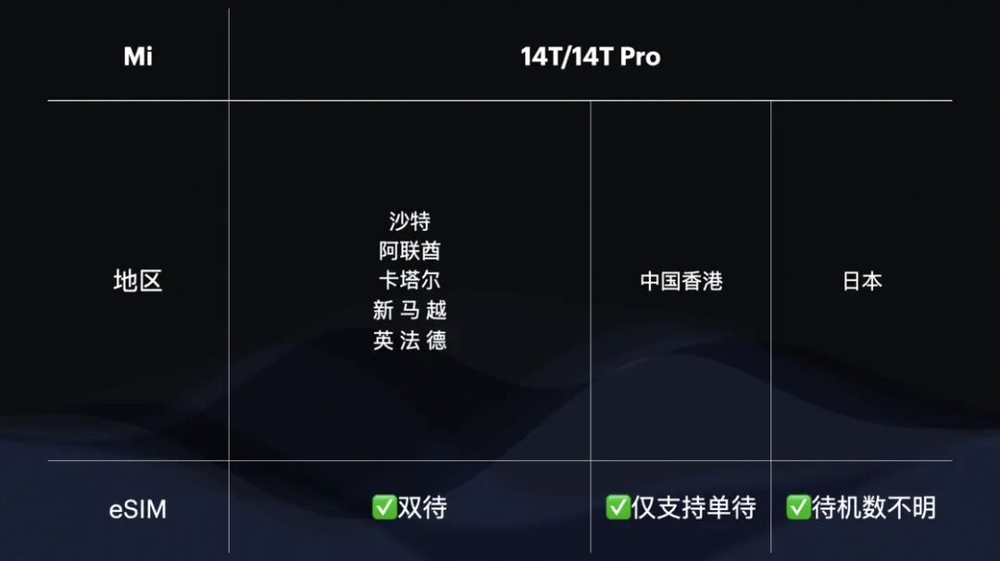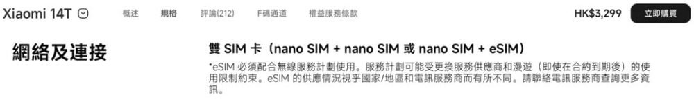 上述所有型号均支持eSIM功能,并且小米在几乎所有页面明确标注了支持eSIM双待的情况。对于14T和14T Pro,香港销售的版本仅支持eSIM单待;其他小米和POCO型号与版本在提供销售的地区均支持eSIM双待,而更亲民定位的红米机型仅支持单待。所有机型均配备双实体SIM卡槽。