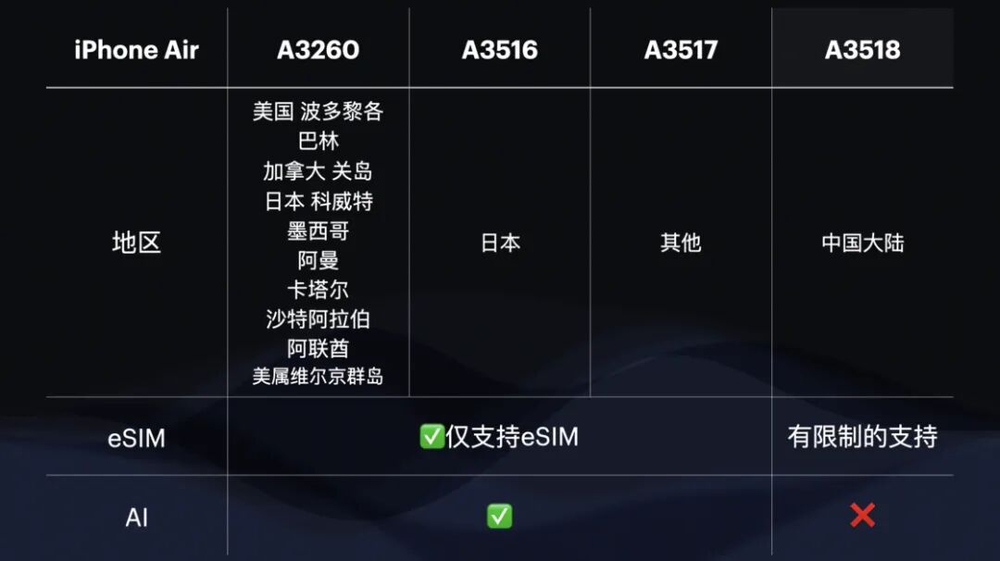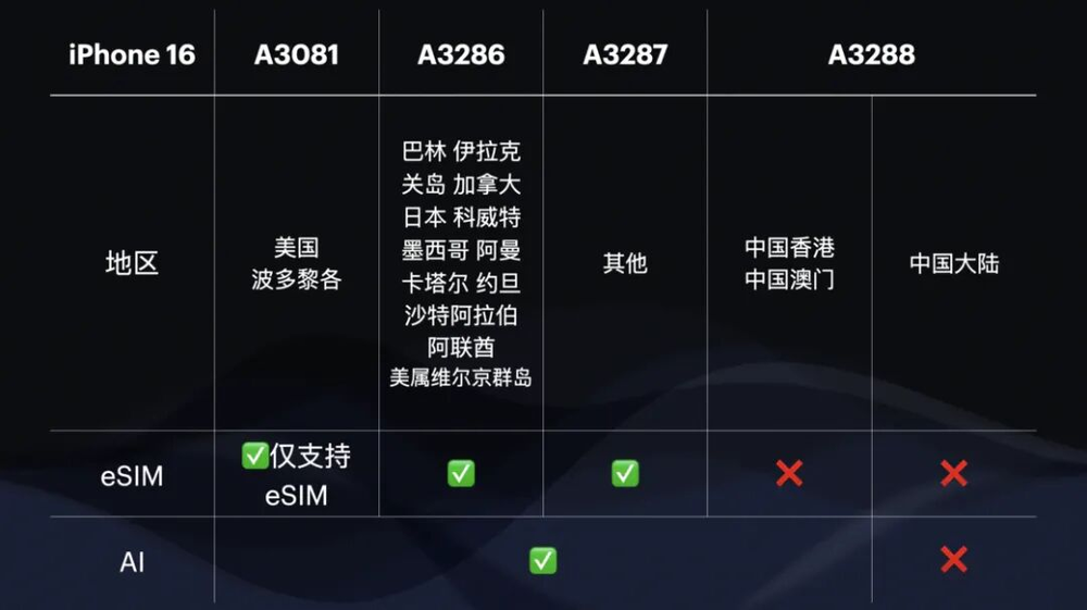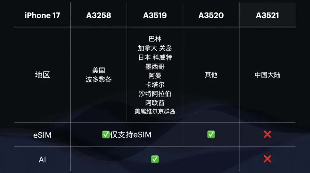 从图中可知从iPhone 16系列(这里所指的系列不含iPhone 16e;系列中四款iPhone销售版本地区分区策略相同,故仅用iPhone 16展示)到iPhone 17系列,主要的变化在于加拿大、日本、墨西哥和中东地区部分国家以及美国海外领土销售的iPhone也转向纯粹的eSIM版本,而香港、澳门销售的iPhone也加入到通行的「国际版」,国行iPhone成为可容纳2张实体SIM卡的唯一版本选项。