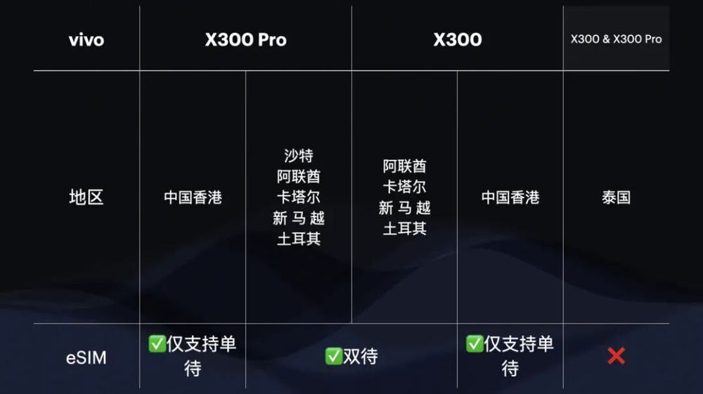 上述所有型号均支持eSIM功能,并且vivo在几乎所有页面明确标注了支持eSIM双待的情况。令人意外的是在泰国销售的版本完全不支持eSIM功能;在香港销售的版本仅支持eSIM单待;其他型号与版本在提供销售的地区均支持eSIM双待,且均配备双实体SIM卡槽。