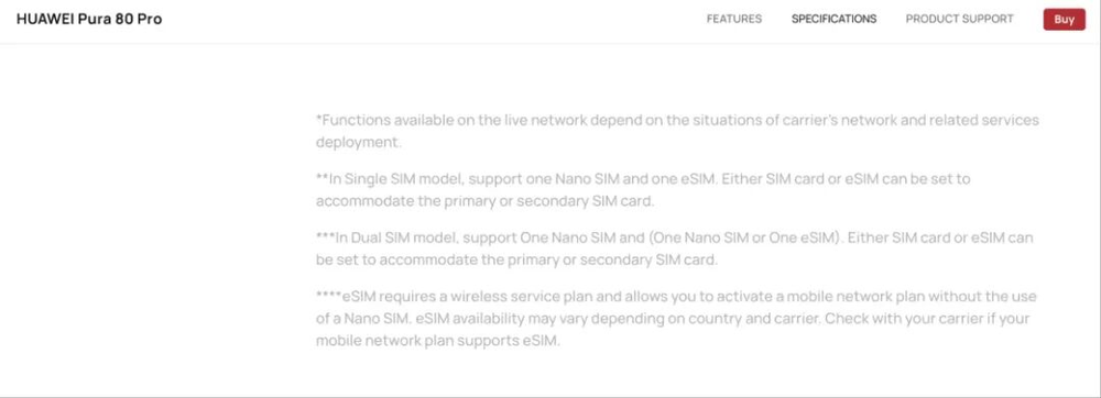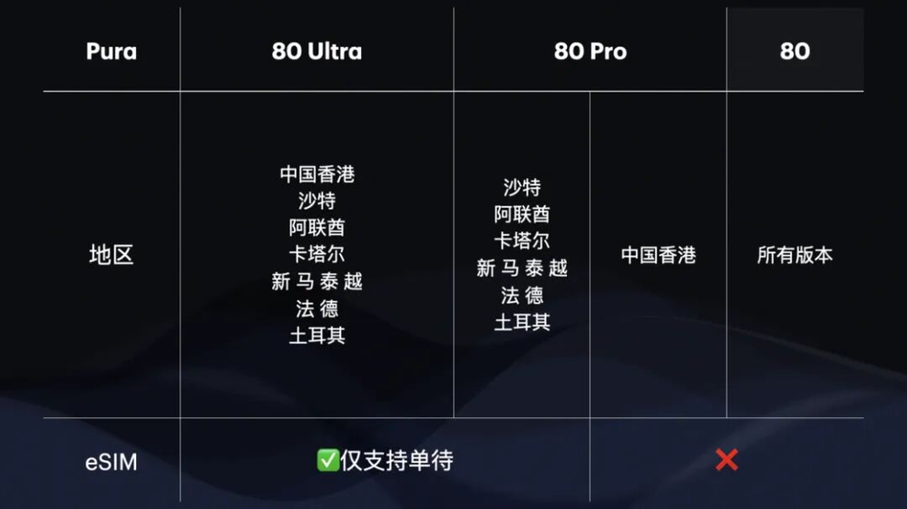从图中可以看到基础版Pura 80不支持eSIM,而在Pura 80 Pro和Ultra中除香港销售的Pura 80 Pro外其他版本均支持eSIM功能。