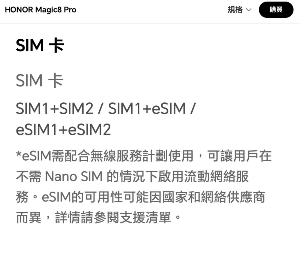 然而官网描述极为有限,eSIM是否支持双待不明。