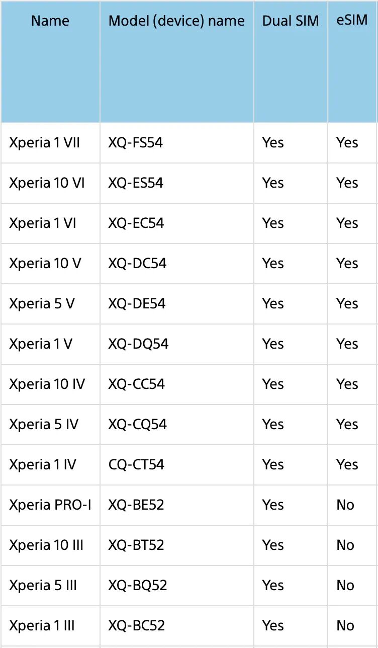 Sony自Xperia 1 IV、Xperia 5 IV以及Xperia 10 IV引入eSIM,仅欧洲地区销售的Xperia(型号以数字「54」结尾,其他版本是「72」结尾)支持。Sony的官网并未说明其eSIM是否支持双待,所有型号均配备双实体SIM卡槽。