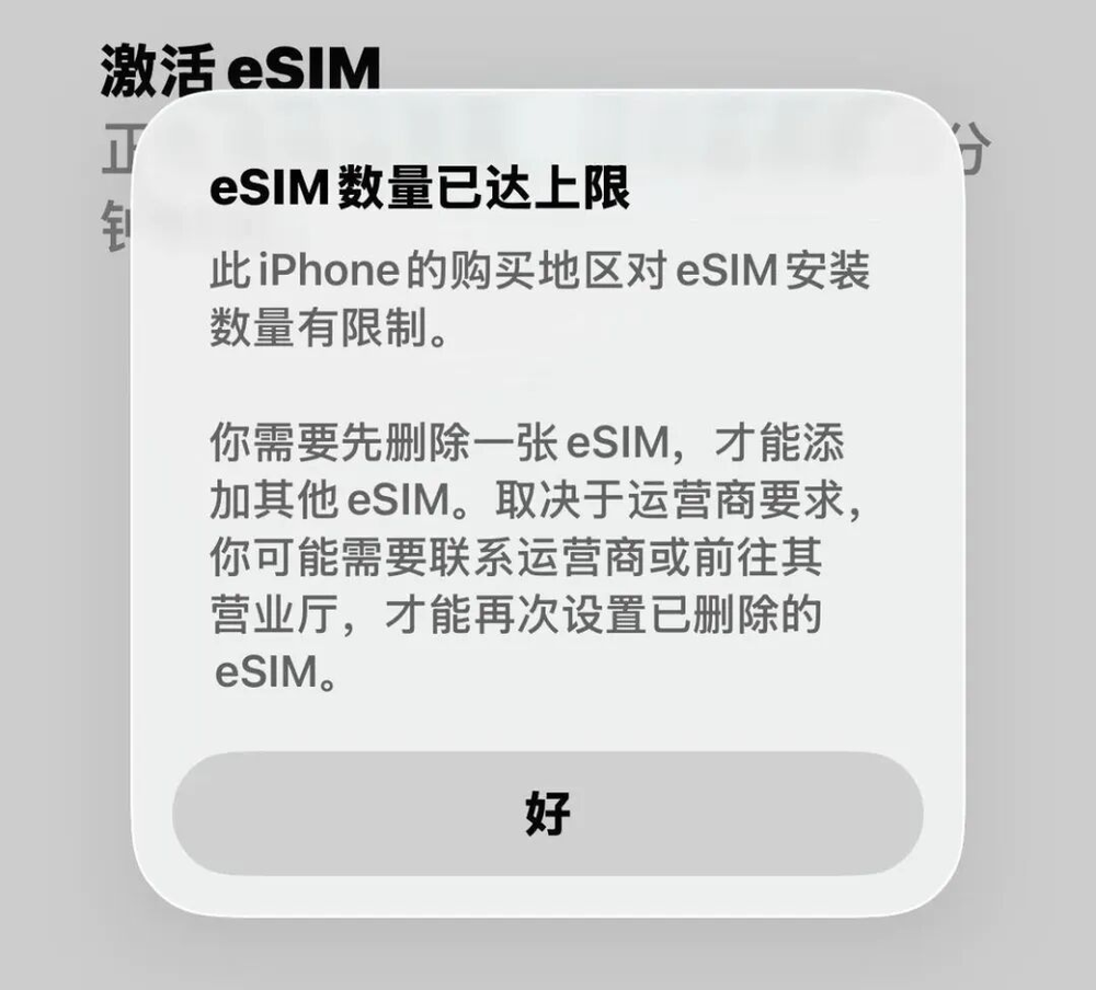 「双eSIM」说法的流行更多是由于国行手机在符合工信部的技术要求或标准下,不论eSIM芯片存储容量大小,最多只能够向其中写入2个eSIM配置文件。在写入eSIM的同时,运营商的系统后台会记录设备与写入+86号码的关联信息。用户若不前往营业厅办理补换卡业务将号码迁出(解除关联),只是将手机上的eSIM号码删除并不意味着腾出卡位。若将带有关联信息的设备以二手的方式转卖,下一任机主或将无法添加新的+86 eSIM号码。