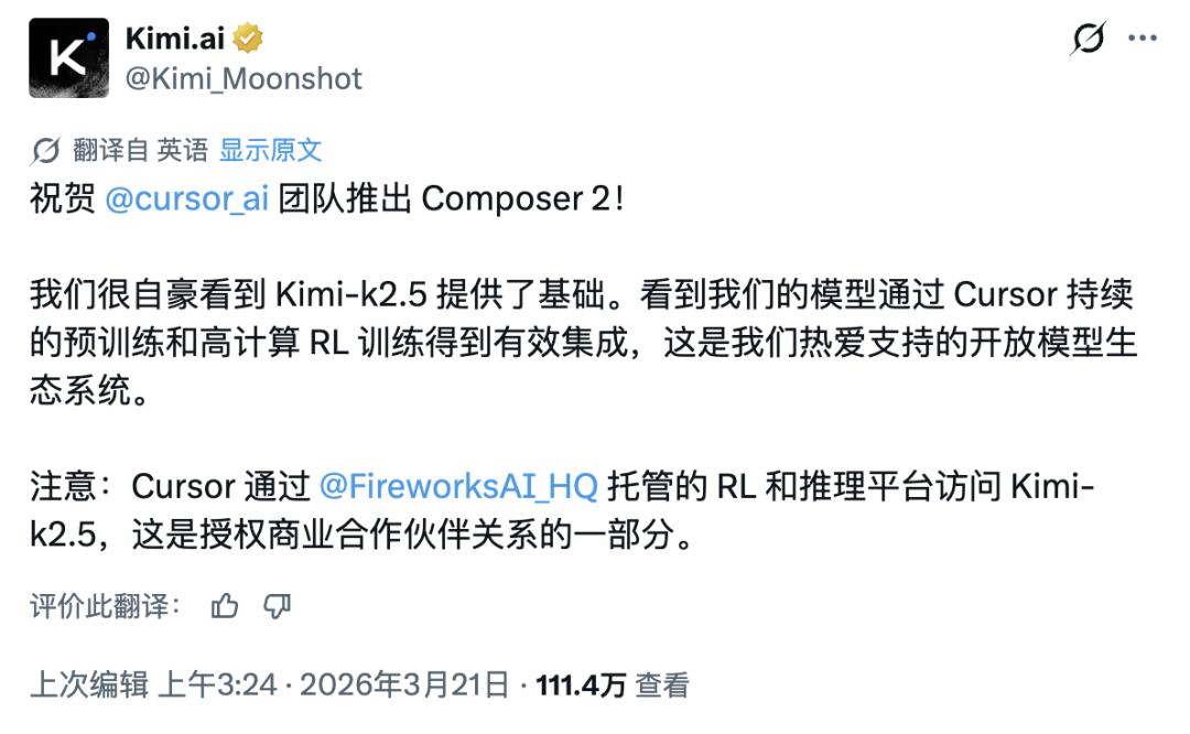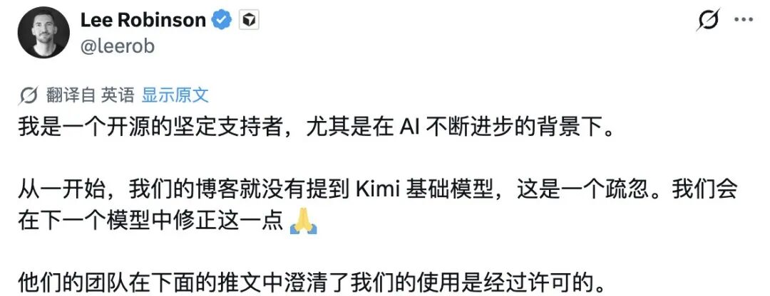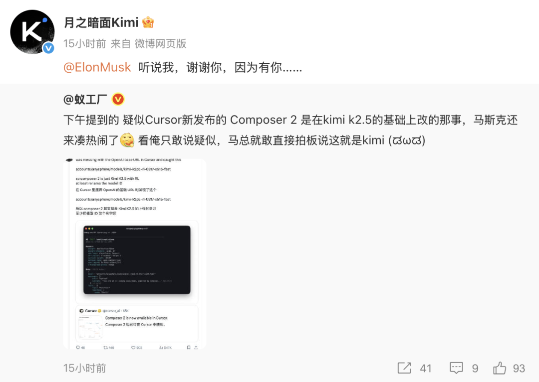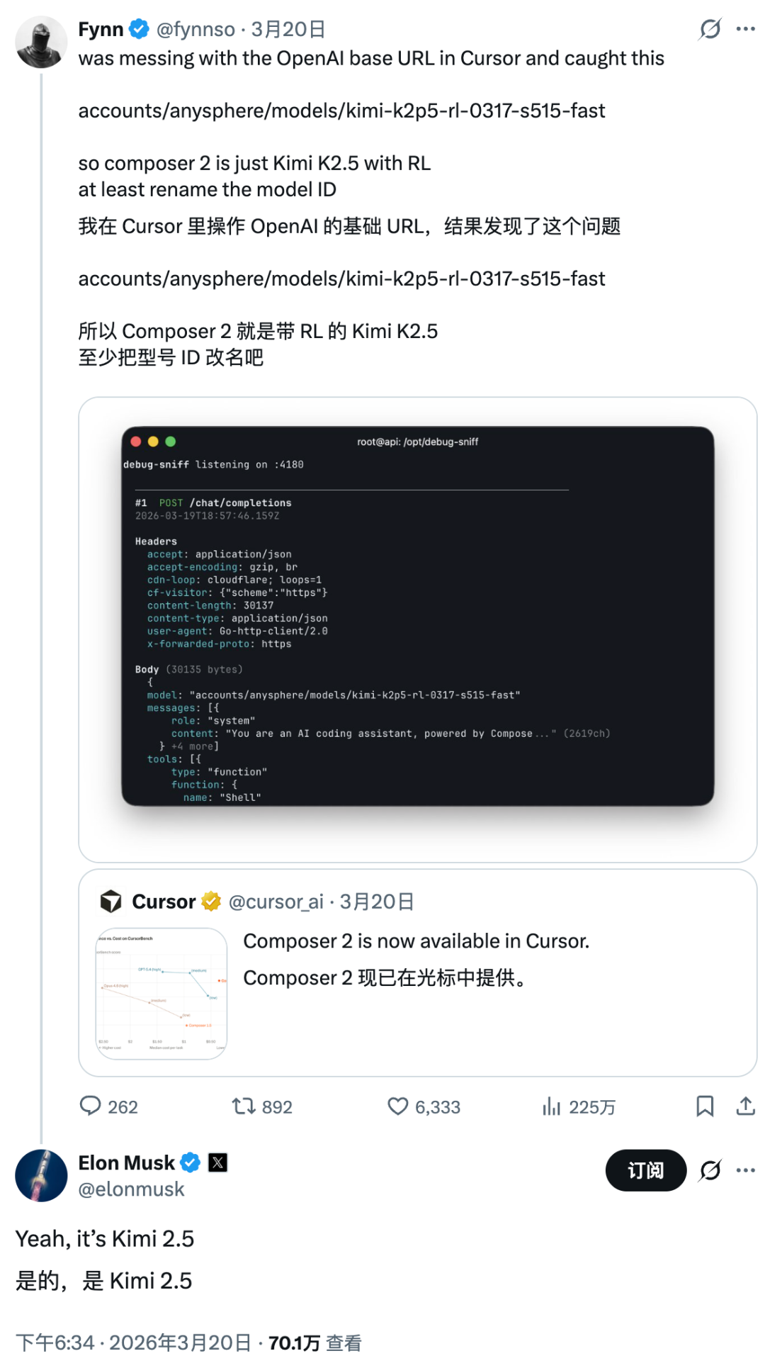 更关键的是,定价每百万 token 仅 0.50 美元,比 Claude Opus 4.6 便宜整整 10 倍。又强又便宜,全网程序员都在高呼 Cursor 已经进化成了完全体。结果没过 24 小时,一个叫 Fynn 的网友在 Cursor 里翻 API 配置时,翻出了一串模型 ID:accounts/anysphere/models/kimi-k2p5-rl-0317-s515-fast,发现这个所谓的自研模型其实是「带 RL 的 Kimi K2.5」。截图一发,评论区沸腾了。马斯克也现身评论区默默补刀:「Yeah, it's Kimi 2.5」。有趣的是,针对马斯克的评论,kimi 今天也在中国社交媒体上表示感谢并回复马斯克:「听说我,谢谢你,因为有你」。而 Moonshot(月之暗面) AI 预训练负责人 Yulun Du 也下场验证 X 网友 Fynn 的说法。他对 Composer 2 做了 tokenizer 测试,发现其与 Kimi 高度吻合,随即 @ 了 Cursor 联合创始人 Michael Truell,公开追问为何没有在发布时披露基座来源,以及是否履行了相关授权义务。另有两名月之暗面员工相继发帖佐证,但现三人已删帖。这里有个背景值得交代。Kimi K2.5 采用的是一套附加商业条款的开源许可证,核心约束是:凡基于该模型构建的商业产品,一旦月活突破 1 亿或月收入超过 2000 万美元,就必须在产品界面显著位置标注模型来源。Kimi K2.5 Github 地址:https://github.com/MoonshotAI/Kimi-K2.5?tab=readme-ov-file而根据彭博社最新消息,Cursor 正与投资者洽谈新一轮融资,估值可能达到 500 亿美元,较去年秋季几乎翻倍,年化收入已突破 20 亿美元,约六成来自大型企业客户。这条条款的适用性,自然成了外界关注的焦点。眼看纸包不住火,Cursor 的高管们开始排队出来「认错」。今天凌晨,Cursor AI 教育负责人 Lee Robinson 发文承认,一开始没提 Kimi 基座「确实是个疏忽」,并强调使用已通过推理合作伙伴 Fireworks 获得了合规授权。Cursor AI 创始人 Aman Sanger 随后补充技术细节:他们评估了大量基座模型,Kimi k2.5 在基准评测结果 perplexity-based evals 里跑分最强,因此选定它作为起点。在此之上做了持续预训练和 4 倍规模的强化学习,最终模型里只有约四分之一的计算量来自 Kimi 基座。值得一提的是,Cursor 一直被外界诟病没有自己的基础模型,核心能力高度依赖 Gemini 等第三方模型,而这些第三方模型恰恰也是它最直接的竞争对手,这意味着 Cursor 在定价、性能和利润上都受制于人。且由于没有自己的预训练团队和算力储备,从零起步的成本和周期都难以承受,借力一个性能强、许可证开放的开源模型,某种程度上也是在现有条件下最快跑通闭环的路径。关于这场风波,目前也有了比较体面的定论。Kimi 官方账号刚刚也在 X 平台发帖确认,Cursor 通过推理平台 Fireworks 以授权商业合作的形式接入,使用完全合规。而风波的核心最终落在信息透明度上,而非版权违规。有网友替 Cursor 说话:在强基座上做预训练和 RL 本就是行业惯例,整个行业都在往这个方向走,这也是当下 GPU 严重短缺、H100 价格飙升的原因之一。但也有人发声质疑。一家估值 500 亿美元、年化收入破 20 亿的硅谷明星公司,在最高光的发布时刻,对模型基座来源只字不提,这种「被抓包才承认」的做法,吃相实在太难看。许可证合规与否,尚且可以事后厘清;但用户的信任,是另一回事。开源生态的运转,靠的正是这种你用了我的、就要说清楚的基本默契。还是网友懂玩梗,🔗 https://x.com/Rock4754/status/2035075231468134761今天是 Kimi,明天可能是别人,如果每家公司都选择性地披露信息,开源的根基就会慢慢被蚕食。Lee Robinson 也最终表态:未来模型会做完整预训练,发布时也会从一开始注明基座信息。抛开这场风波本身,一家估值 500 亿美元的硅谷明星公司,在最需要拿出硬核技术证明自己的时刻,选择的基座是一个来自中国的开源模型。这对 Kimi 而言,是一次比任何发布会都有说服力的背书。也是在本周,日企乐天 (Rakuten) 发布了最新的「自研大模型」Rukuten AI 3.0 。结果 Hugging Face 上,该模型赫然在自己的配置文件里面写着架构来自 DeepSeek V3。