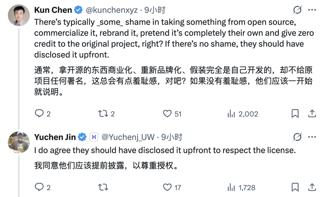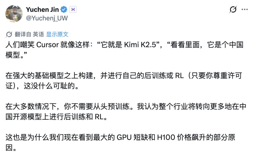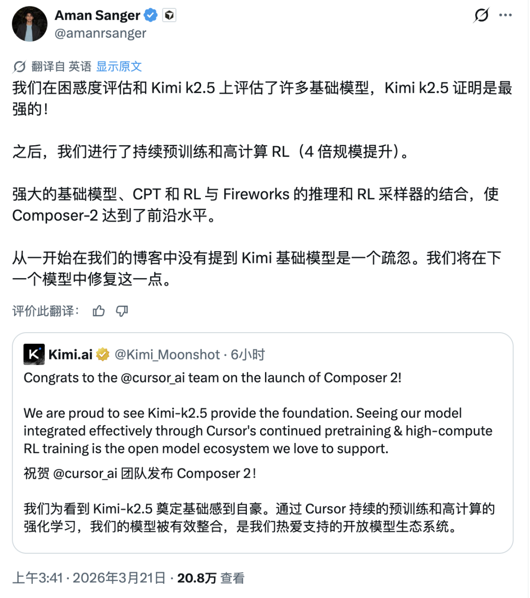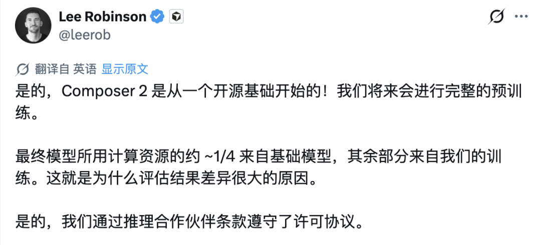 更关键的是,定价每百万 token 仅 0.50 美元,比 Claude Opus 4.6 便宜整整 10 倍。又强又便宜,全网程序员都在高呼 Cursor 已经进化成了完全体。结果没过 24 小时,一个叫 Fynn 的网友在 Cursor 里翻 API 配置时,翻出了一串模型 ID:accounts/anysphere/models/kimi-k2p5-rl-0317-s515-fast,发现这个所谓的自研模型其实是「带 RL 的 Kimi K2.5」。截图一发,评论区沸腾了。马斯克也现身评论区默默补刀:「Yeah, it's Kimi 2.5」。有趣的是,针对马斯克的评论,kimi 今天也在中国社交媒体上表示感谢并回复马斯克:「听说我,谢谢你,因为有你」。而 Moonshot(月之暗面) AI 预训练负责人 Yulun Du 也下场验证 X 网友 Fynn 的说法。他对 Composer 2 做了 tokenizer 测试,发现其与 Kimi 高度吻合,随即 @ 了 Cursor 联合创始人 Michael Truell,公开追问为何没有在发布时披露基座来源,以及是否履行了相关授权义务。另有两名月之暗面员工相继发帖佐证,但现三人已删帖。这里有个背景值得交代。Kimi K2.5 采用的是一套附加商业条款的开源许可证,核心约束是:凡基于该模型构建的商业产品,一旦月活突破 1 亿或月收入超过 2000 万美元,就必须在产品界面显著位置标注模型来源。Kimi K2.5 Github 地址:https://github.com/MoonshotAI/Kimi-K2.5?tab=readme-ov-file而根据彭博社最新消息,Cursor 正与投资者洽谈新一轮融资,估值可能达到 500 亿美元,较去年秋季几乎翻倍,年化收入已突破 20 亿美元,约六成来自大型企业客户。这条条款的适用性,自然成了外界关注的焦点。眼看纸包不住火,Cursor 的高管们开始排队出来「认错」。今天凌晨,Cursor AI 教育负责人 Lee Robinson 发文承认,一开始没提 Kimi 基座「确实是个疏忽」,并强调使用已通过推理合作伙伴 Fireworks 获得了合规授权。Cursor AI 创始人 Aman Sanger 随后补充技术细节:他们评估了大量基座模型,Kimi k2.5 在基准评测结果 perplexity-based evals 里跑分最强,因此选定它作为起点。在此之上做了持续预训练和 4 倍规模的强化学习,最终模型里只有约四分之一的计算量来自 Kimi 基座。值得一提的是,Cursor 一直被外界诟病没有自己的基础模型,核心能力高度依赖 Gemini 等第三方模型,而这些第三方模型恰恰也是它最直接的竞争对手,这意味着 Cursor 在定价、性能和利润上都受制于人。且由于没有自己的预训练团队和算力储备,从零起步的成本和周期都难以承受,借力一个性能强、许可证开放的开源模型,某种程度上也是在现有条件下最快跑通闭环的路径。关于这场风波,目前也有了比较体面的定论。Kimi 官方账号刚刚也在 X 平台发帖确认,Cursor 通过推理平台 Fireworks 以授权商业合作的形式接入,使用完全合规。而风波的核心最终落在信息透明度上,而非版权违规。有网友替 Cursor 说话:在强基座上做预训练和 RL 本就是行业惯例,整个行业都在往这个方向走,这也是当下 GPU 严重短缺、H100 价格飙升的原因之一。但也有人发声质疑。一家估值 500 亿美元、年化收入破 20 亿的硅谷明星公司,在最高光的发布时刻,对模型基座来源只字不提,这种「被抓包才承认」的做法,吃相实在太难看。许可证合规与否,尚且可以事后厘清;但用户的信任,是另一回事。开源生态的运转,靠的正是这种你用了我的、就要说清楚的基本默契。还是网友懂玩梗,🔗 https://x.com/Rock4754/status/2035075231468134761今天是 Kimi,明天可能是别人,如果每家公司都选择性地披露信息,开源的根基就会慢慢被蚕食。Lee Robinson 也最终表态:未来模型会做完整预训练,发布时也会从一开始注明基座信息。抛开这场风波本身,一家估值 500 亿美元的硅谷明星公司,在最需要拿出硬核技术证明自己的时刻,选择的基座是一个来自中国的开源模型。这对 Kimi 而言,是一次比任何发布会都有说服力的背书。也是在本周,日企乐天 (Rakuten) 发布了最新的「自研大模型」Rukuten AI 3.0 。结果 Hugging Face 上,该模型赫然在自己的配置文件里面写着架构来自 DeepSeek V3。
