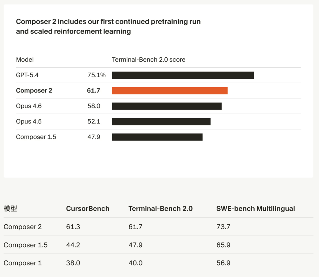 在硅谷,造神和毁神的速度一样快。但像 Cursor 这样,在 24 小时内完成从「拳打 OpenAI、脚踢 Anthropic」到「连夜滑跪」的流程,确实十分令人感慨。3 月 20 日,知名 AI 代码编辑器 Cursor 高调发布了所谓的编程模型 Composer 2,结果被网友质疑「套壳」 Kimi K2.5。(APSPO 注释:Cursor 是一款基于 VS Code 深度改造的 AI 原生代码编辑器,由 Anysphere 公司于 2022 年推出。它深度集成了 Claude、ChatGPT、Gemini 等主流 AI 模型,主打自然语言写代码的编程体验。)而从官方口径来看, Composer 2 的性能简直是降维打击:全基准大幅领先前代,首次引入持续预训练,叠加大规模强化学习,能解决需要数百个操作的高难度编程任务。号称超越 Claude Opus 4.6 的性能数据,也确实拿得出手。内部基准 CursorBench 得分从上一代的 44.2 跳升至 61.3,直接超过 Claude Opus 4.6 的 58.2,无限逼近 GPT-5.4 Thinking 的 63.9。