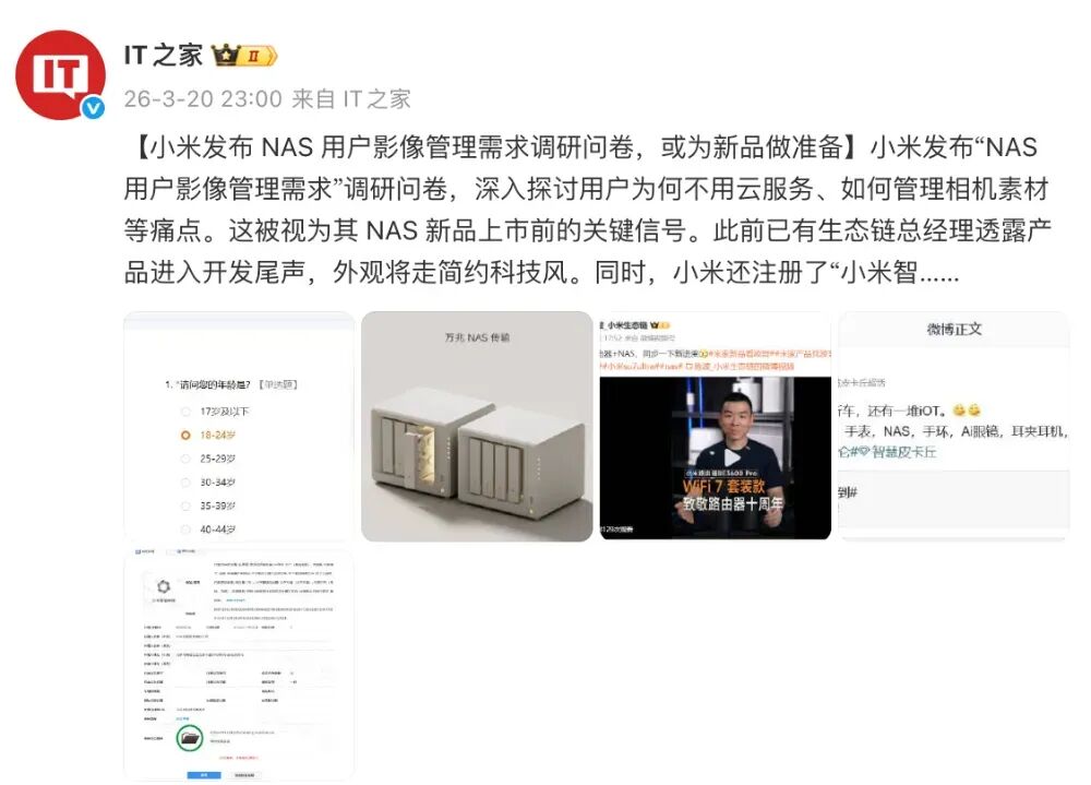 此前有消息称,小米NAS会在小米17系列的发布活动中一同亮相,但实际却并非如此。因此也有消息认为其最终不会到来。不过,随着时间的推进,现在关于小米NAS也陆续出现了新的消息。小米发布“NAS 用户影像管理需求”调研问卷,深入探讨用户为何不用云服务、如何管理相机素材等痛点。这被视为其 NAS 新品上市前的关键信号。