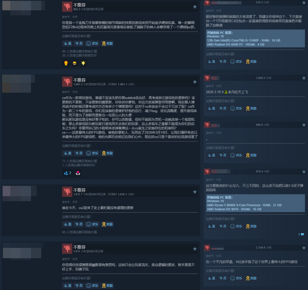 所以整个CS社区的反应可想而知:Steam端那篇更新日志的点赞数量为零;CS2在3月19日当天的好评率只有31%;国内外从普通玩家到职业选手,都在通过各种渠道公开表达对这次更新的不满,甚至有玩家表示“V社亲手毁掉了有史以来最伟大的FPS游戏”。