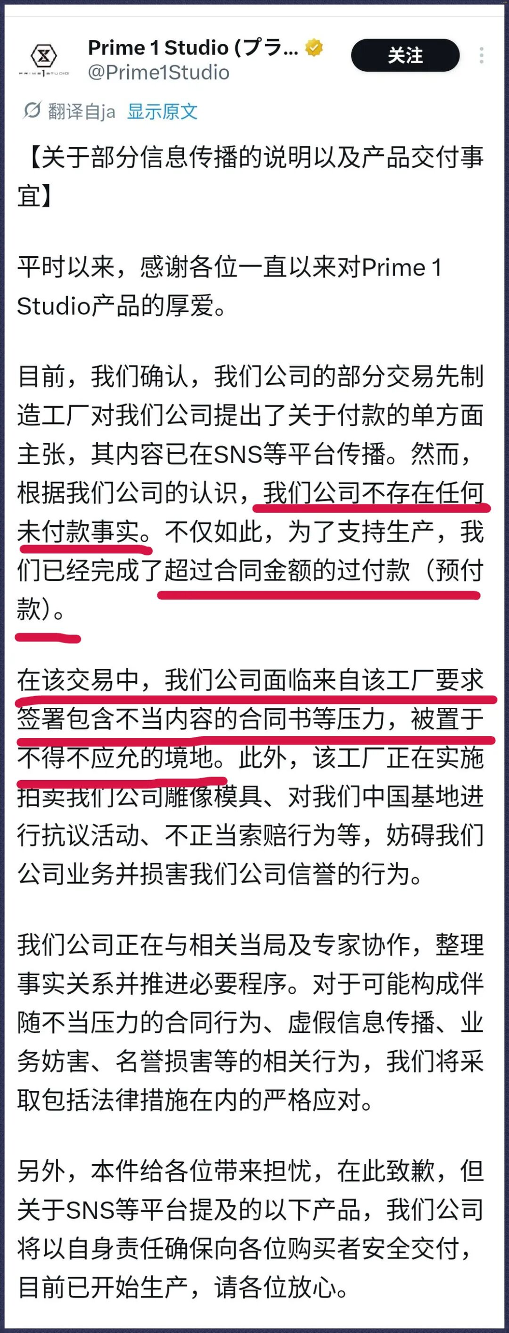 日文公告里强调不存在未结清款项,相反,已经支付了超出合同金额的预付款。甚至在此次交易中受到工厂的压力,被迫签署了一份条款不公平的合同。