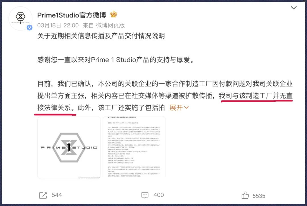 一家位于惠州的雕像代工厂公开控诉,与日本高端雕像品牌Prime 1 Studio(简称P1S)合作长达5年,却在最近被对方关联公司拖欠160多万元的货款。