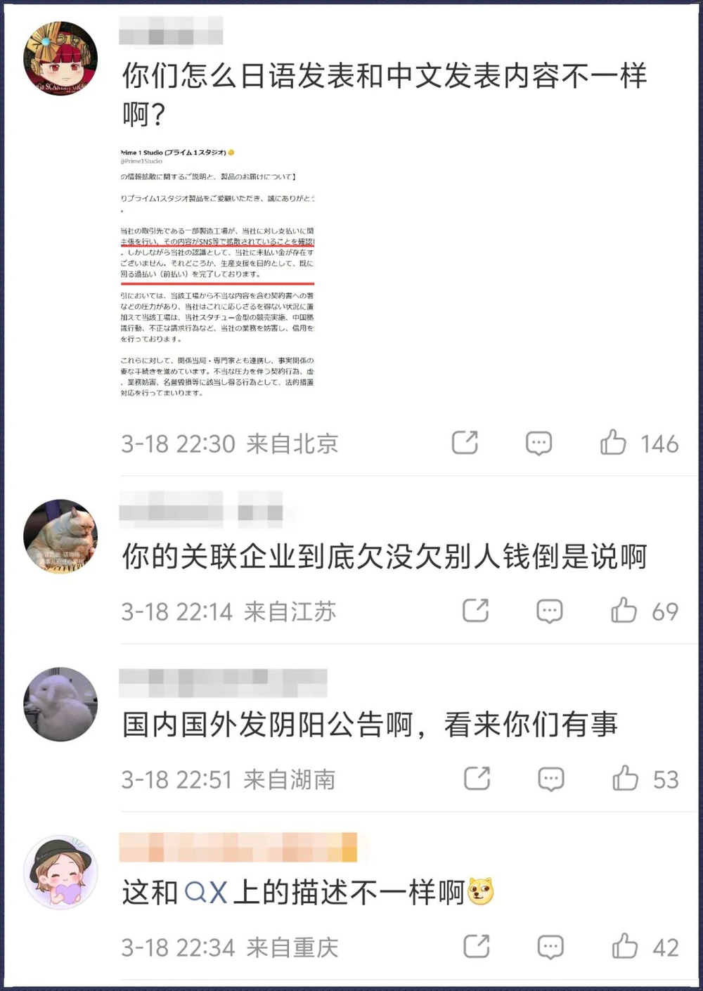 3月19日早些时候,中方手办厂发表了一篇长文回应了日方声明,表示P1S的声明中存在不实信息、且中日两版公告存在出入。