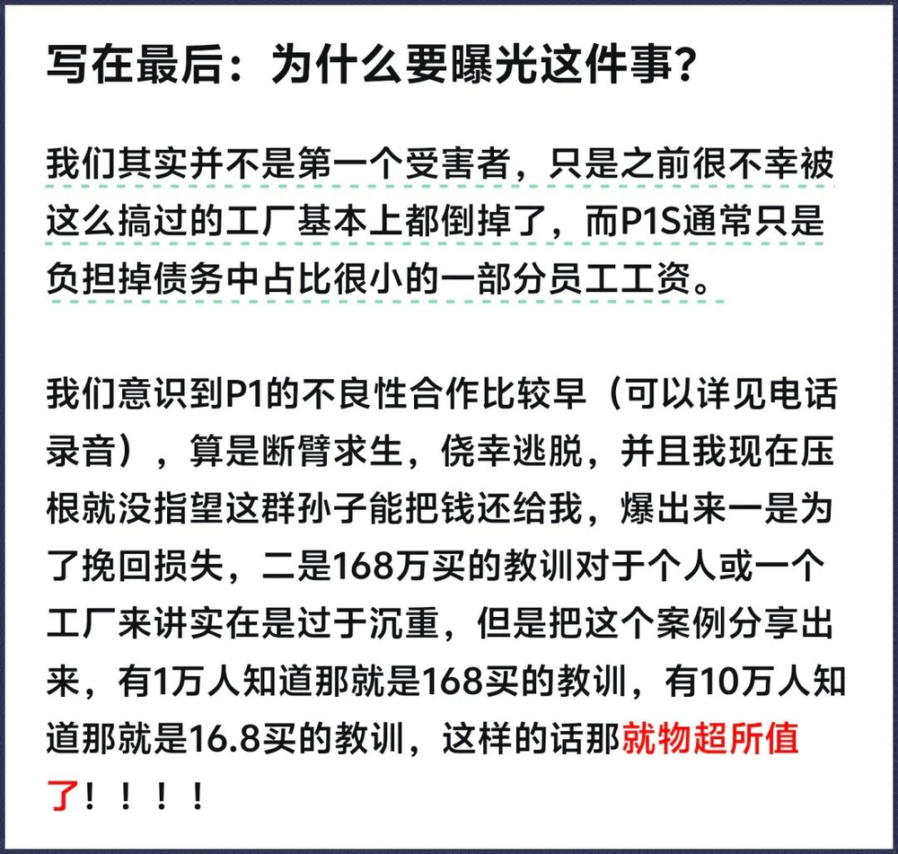 目前双方各执一词:工厂称被骗货+假水单,已报警;P1S则全盘否认欠款,反指工厂侵权、妨碍业务,将追究法律责任。