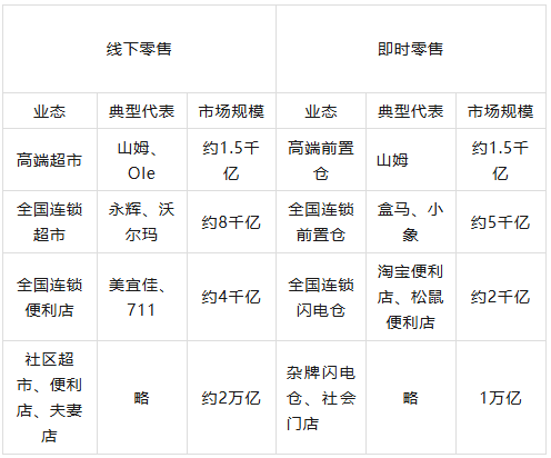 用线下零售的业态结构类比即时零售的业态结构是非常合理,大家也更容易理解,如下是我的总结: