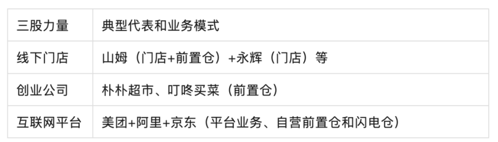 即时零售主要由三股力量推动,分别是线下门店+创业公司+互联网平台。