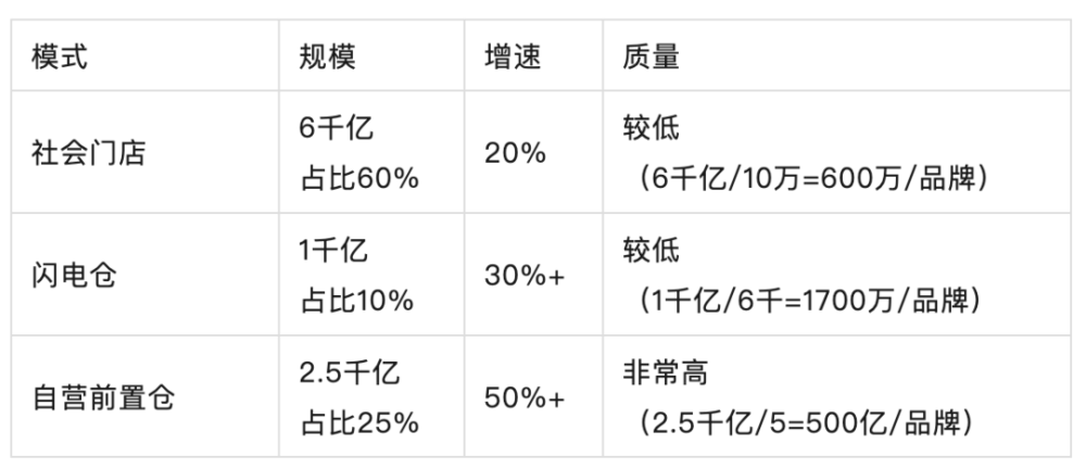 从规模、增速和质量来看,前置仓明显全面优于闪电仓的表现,在增速和质量上明显优于社会门店。