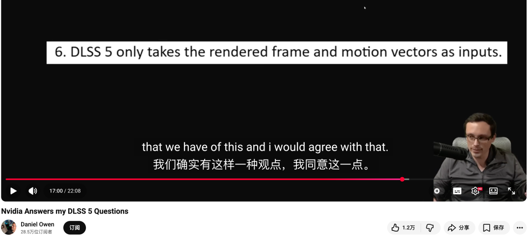 可以看到,这位英伟达布道师并没有直接回答 Owen 的提问。但是他所说的「完全通过分析单帧来完成」已经揭开了真相:DLSS 5 并没有跟游戏引擎合作,甚至不需要游戏引擎,它的唯一输入,就是当前帧。