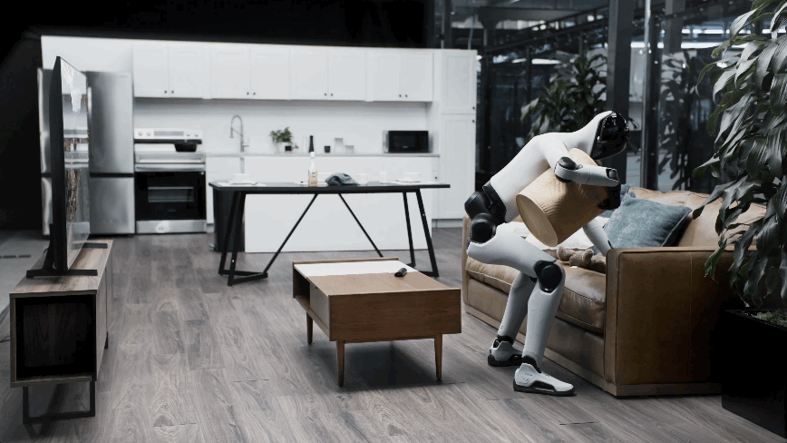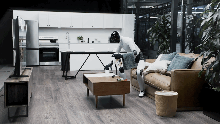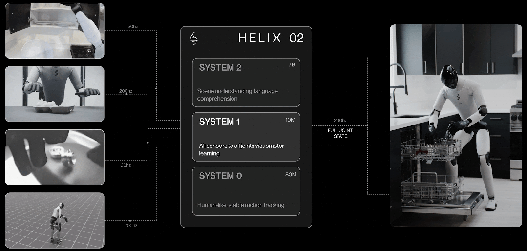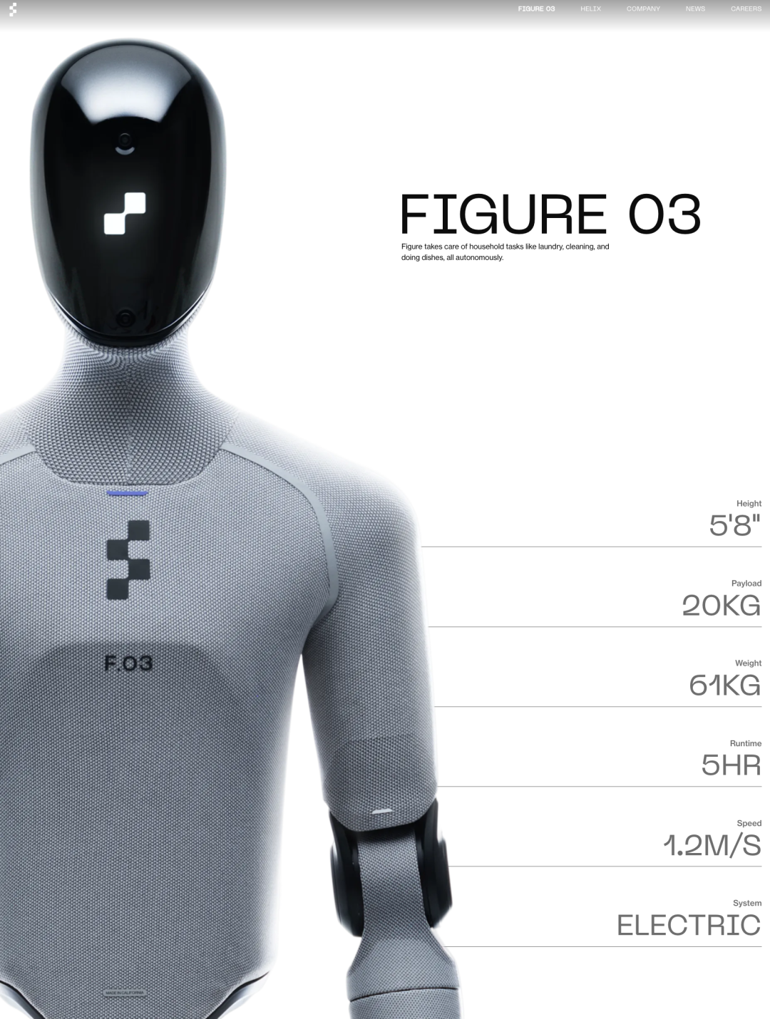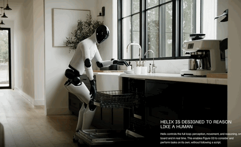 自从在春晚上,机器人展示了各种吹拉弹唱技能之后,很难让人不做进一步想象:搞快点,传说中的家务机器人能不能再搞快点。人形机器人公司 Figure 前不久发布了一段新视频,没有跳舞,没有翻跟头,就是展示家务技能。一台 Figure 03 机器人走进一间散乱的客厅,环顾四周一圈,然后开始干活:把地上的玩具捡起来丢进收纳箱,拿起喷雾剂喷在茶几上再用毛巾擦干净,把沙发上的抱枕拍松扔回原位,甚至拿起遥控器按下关机键把电视关掉。全程没有任何人类指令,没有遥控操作,一镜到底。这段视频在社交媒体上迅速传播,比起各种「酷炫」的机器人 demo,它做的事情很平凡——都是你每天回家后不想做、但又不得不做的事。特别的是,Figure 并不是发布一台新机器人,硬件仍然是去年 10 月发布的 Figure 03。这次带来升级变化的,是一套全新的 AI 控制系统 Helix。Helix 02 的核心突破在于一个概念:全身自主性(full-body autonomy)。此前的人形机器人,包括 Figure 自己的上一代系统 Helix,大多只能控制上半身,能站在原地伸手抓东西已经算不错了。走动的时候,系统需要先停下手上的动作、稳定身体、迈步、再停下来、再伸手。这种「走-停-做-停-走」的模式意味着机器人但凡做点什么,可能需要花上你自己做的十倍时间,完全本末倒置。Helix 02 把这个过程彻底打通了。它用一个单一的神经网络同时控制行走、平衡和操作,机器人可以一边走路一边端着碗,可以在手上拿着东西的时候用胯关门,甚至可以在双手被占用时用脚把洗碗机的门踢开。这听起来像是人做家务时最自然不过的动作,但对机器人来说,这是一个困扰了学术界和工业界数十年的难题,loco-manipulation,即移动与操作的统一控制。Helix 02 的架构分为三层,可以类比人类的思考方式:System 2(慢思考)负责语义理解:看一眼客厅,判断哪些东西是乱的、应该放哪儿去、先做什么后做什么。这一层处理的是「理解」和「规划」。System 1(快思考)负责把理解转化为动作:以每秒 200 次的频率将视觉、触觉、本体感知等所有传感器的数据转化成全身关节的目标位置。这一层处理的是「决策」。System 0(本能层)是这次最大的新增。它以每秒 1000 次的频率运行,负责平衡、接触和全身协调。Figure 用超过1000 小时的人类运动数据和模拟环境中的强化学习训练出了这个底层控制器。用 Figure 的话说,这个 10M 参数的神经网络替代了原来 109,504 行手写 C++代码。这个三层结构的结果就是:机器人看起来不再像一个在执行预编程指令的机器,而更像一个正在「做家务」的人——动作连贯、有节奏、偶尔还会做出一些看起来很「聪明」的临时决策(比如把杯子挪开检查污渍)。Helix 02 之所以能做到这些,也离不开 Figure 03 这个硬件平台的配合。这台机器人身高 5 英尺 8 英寸(约 168 厘米),体重 61 公斤,一次充电可以工作 5 小时。相比上一代的 Figure 02,它有几个关键变化:手掌摄像头和触觉传感器。每只手的掌心都内嵌了一个广角摄像头,在主摄像头被遮挡时(比如伸手进柜子里摸东西)提供近距离视觉反馈。每个指尖都有触觉传感器,灵敏到可以感知 3 克的力。这使得机器人能从一堆散乱的小物件中精准地拾取单个目标,甚至能用注射器精确推出 5 毫升液体。全身覆盖软性材料。不再是冷冰冰的金属外壳,而是可拆卸、可清洗的软面料,战略性地放置了多密度泡沫来防止夹伤。无线充电。脚底内嵌感应线圈,站上充电底座即可以 2 千瓦功率充电。不需要人去插线,机器人可以自己走去充电。这些细节指向一个明确的产品定位:Figure 03 不是一台实验室样机,而是一台为了进入家庭而设计的消费品。年初底发布时,Figure 把演示场景选在了厨房,机器人自主完成了一个长达 4 分钟的完整任务。走到洗碗机前、打开门、取出碗碟、走到橱柜前放好、再走回来装载脏碗碟、关门启动。全程 61 个连续动作,无中断。Figure 称这是「人形机器人迄今为止完成的最长时间、最复杂的自主任务」。3 月这次的演示,则把难度往上推了一层,来到了客厅。厨房虽然复杂,但物品摆放相对固定、动作路径相对可预测。客厅则是一个每天都在变的空间。玩具散落的位置不同,沙发垫的状态不同,茶几上的杯子数量不同。软性物品(毛巾、抱枕)的物理行为难以预测。家具之间的通道狭窄,需要侧身通过。很多动作需要双手配合,另一些则需要在任务进行中临时腾出一只手。而且这次演示还加入了工具使用——喷雾瓶 + 擦拭、遥控器按键——这要求机器人不仅理解物品「是什么」,还要理解物品「怎么用」。Figure 强调了一个关键点:从厨房到客厅,Helix 02 没有更换任何算法,也没有做任何专项工程优化,仅仅是增加了训练数据。同一套通用架构,喂更多数据就能学会新技能。这暗示了一个令人兴奋的扩展逻辑:如果收拾客厅只需要「多看几遍示范」,那收拾卧室、整理衣柜、浇花、喂猫呢?大有可为啊。目前 Figure 03 的估计售价在 5 万到 10 万美元之间。即便 Figure 提出了订阅制(robot-as-a-service)的商业模式,每台机器人年均产生约 5000 美元收入,这个价格也远非普通家庭可以承受。而且,演示视频和真实家庭环境之间还是存在差距。另外,视频中的客厅虽然看起来很「日常」,但它仍然是一个受控场景。真实家庭有宠物、有小孩、有堆满快递盒的角落、有你三周没洗的衣服堆。但换一个角度看,H