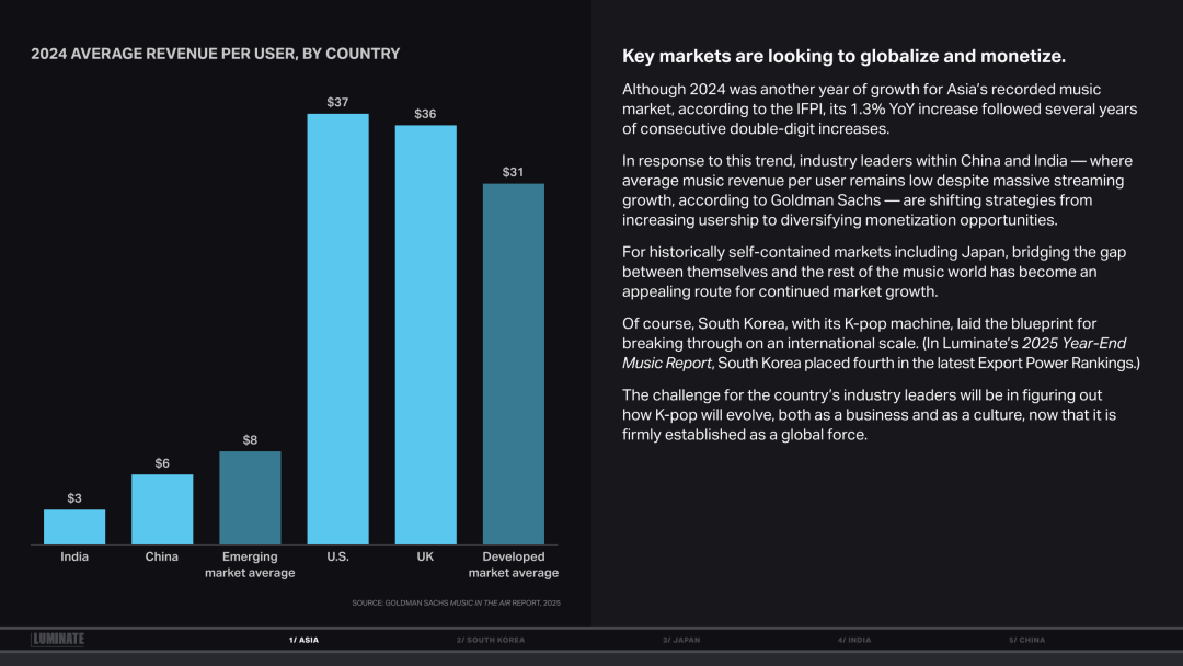整体来看,亚洲音乐产业正从“增长市场”向“规则制定者”演进。一方面,流媒体渗透率提升与年轻用户结构推动长期需求扩张;另一方面,低ARPU、文化差异与基础设施瓶颈仍制约商业化效率。未来趋势将集中在三条路径:一是通过会员分层与粉丝经济提升单用户价值;二是通过本地化全球生产体系复制K-pop模式;三是借助AI与数字生态重塑内容生产与消费方式。亚洲不再只是全球音乐的增量来源,而正在成为创新模式与商业逻辑的输出中心。