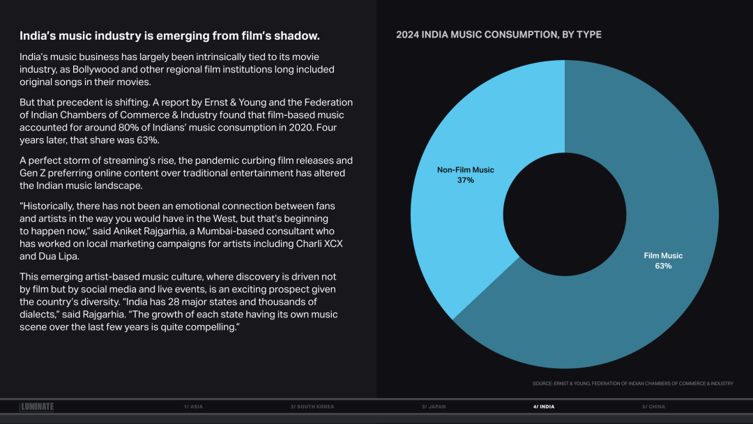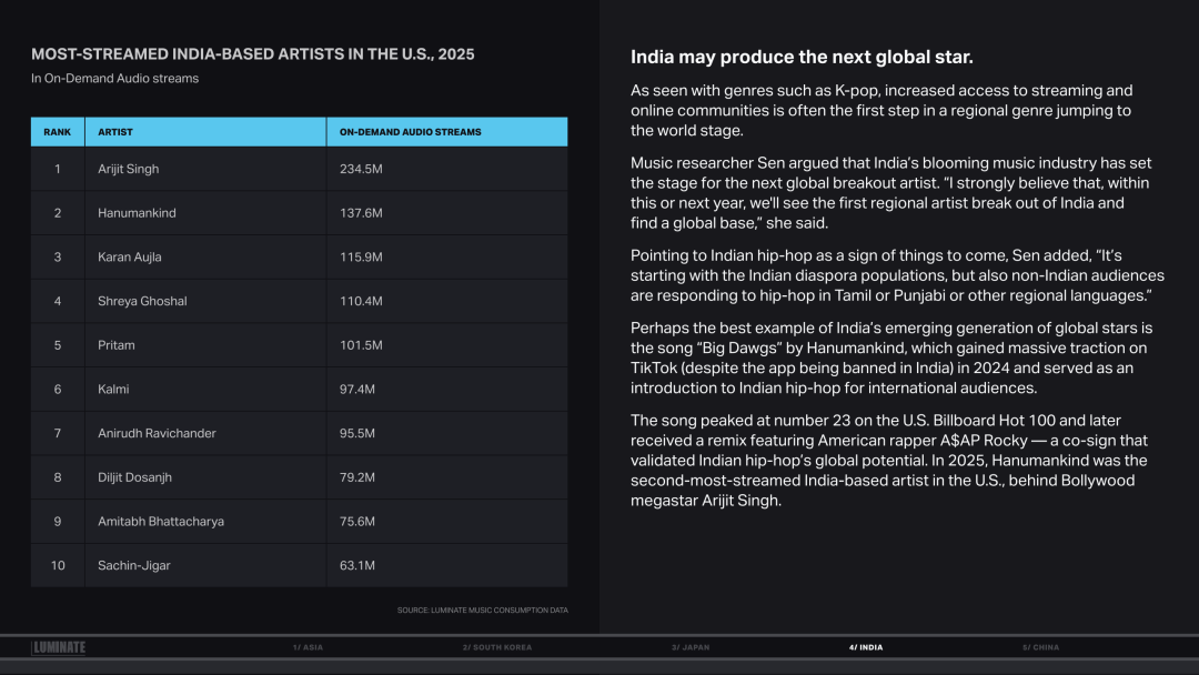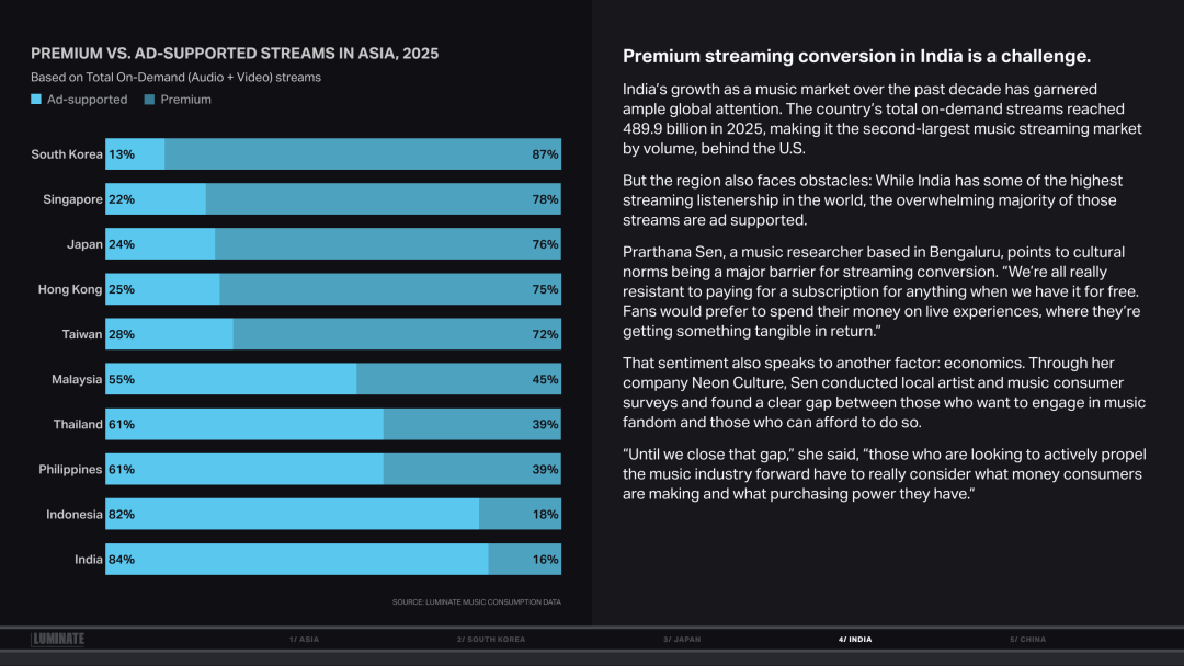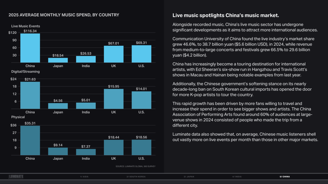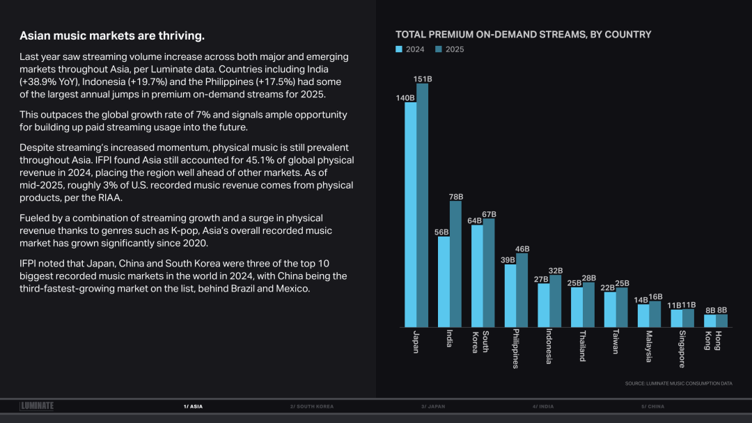 亚洲音乐市场正在进入结构性扩张阶段,流媒体与实体消费双轮驱动成为核心特征。根据报告第5页数据,2025年印度、印尼和菲律宾的付费点播流媒体分别同比增长38.9%、19.7%和17.5%,显著高于全球7%的平均增速 。与此同时,亚洲在2024年贡献了全球45.1%的实体音乐收入,占比远超欧美市场,形成“数字增长+实体韧性”的独特结构。日本、中国和韩国均跻身全球前十大音乐市场,中国更成为增长速度第三快的市场,显示出区域规模与增长潜力的叠加效应。