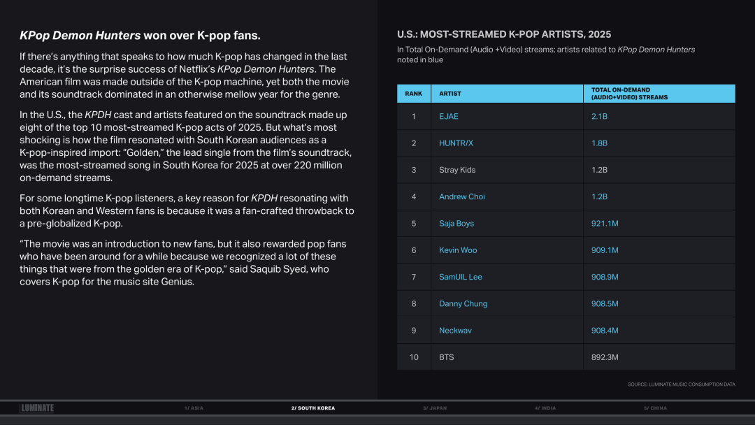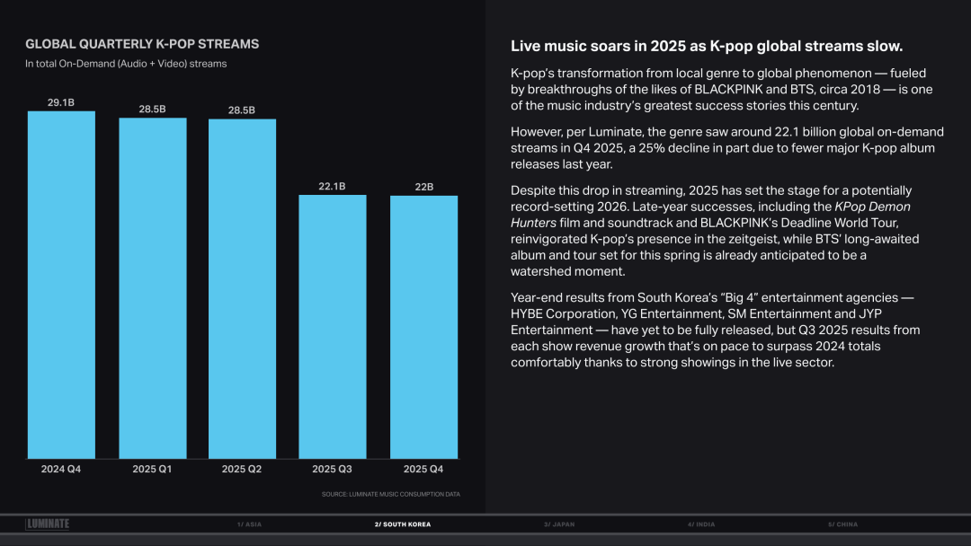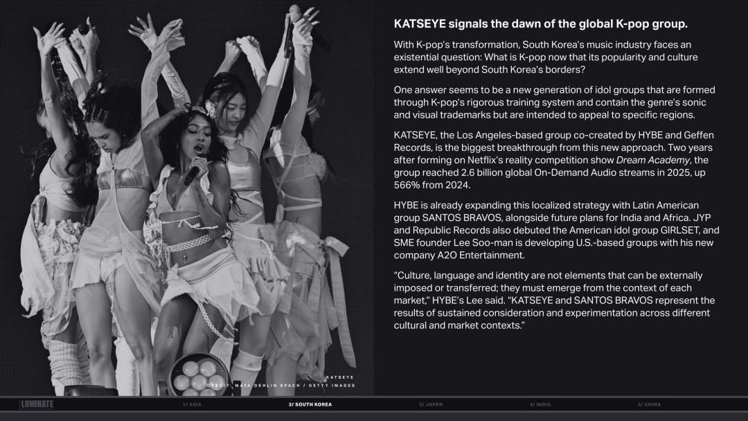 韩国市场则展现出全球化范式的演进路径。尽管2025年第四季度K-pop全球流媒体下降至221亿次,同比下滑约25%,但线下演出与IP衍生成为新的增长引擎 。同时,新一代“本地化全球组合”模式兴起,如KATSEYE在2025年实现26亿次播放,同比增长566%,标志着K-pop从“内容出口”向“体系输出”转型。这一模式通过在不同地区孵化本地艺人,实现文化适配与商业扩张的平衡。
