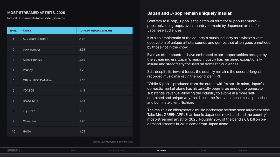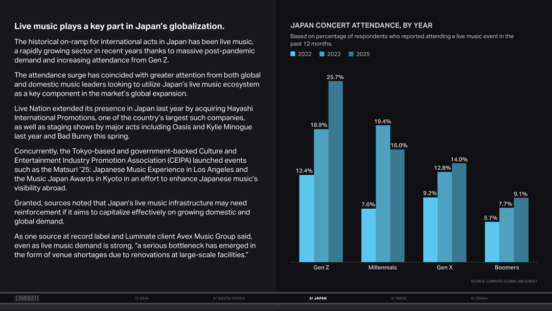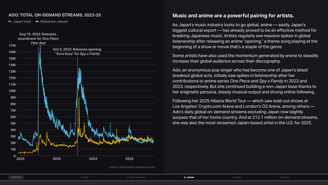 日本市场则呈现出“高体量、低外溢”的独特结构。作为全球第二大音乐市场,其头部艺人约95%的流量仍来自本土 。但动漫正在成为突破口,例如Ado通过动漫主题曲实现全球流量跃迁,在2025年其海外流媒体已超过日本本土。此外,线下演出成为国际化关键通道,日本演出参与率从2022年的12.4%上升至2025年的25.7%,但场馆供给不足已成为增长瓶颈。