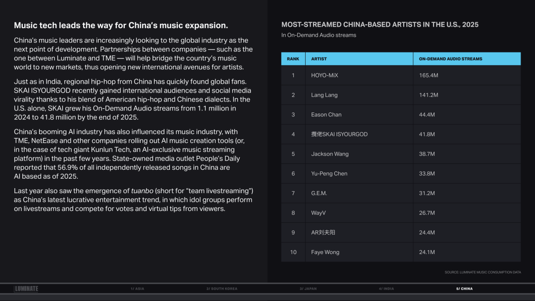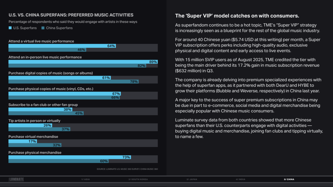印度与中国则分别代表“规模潜力”与“技术驱动”。印度2025年总流媒体量达4899亿次,全球第二,但电影音乐占比从2020年的80%下降至2024年的63%,独立音乐生态正在形成 。中国则通过技术与消费创新推动产业升级,56.9%的独立发行音乐已由AI生成,同时线下市场规模在2024年达到387亿元,同比增长46.6%。此外,中国用户在虚拟商品、打赏及粉丝经济上的参与度显著高于美国,显示出数字消费生态的领先性。