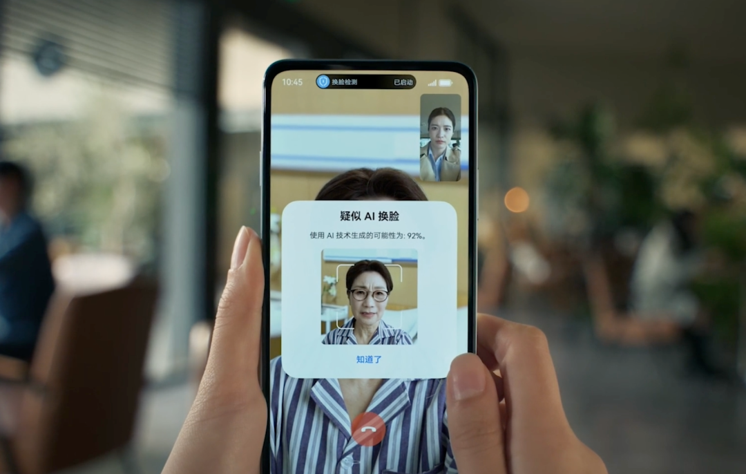 其次是AI换脸检测。当被守护人接到疑似AI换脸的视频通话时,手机会智能识别视频中的人脸是否为合成生成,并向守护人发送风险通知。在这个AI技术被滥用的时代,这个功能的价值不言而喻,它可能是阻止一场诈骗的最后一道防线。