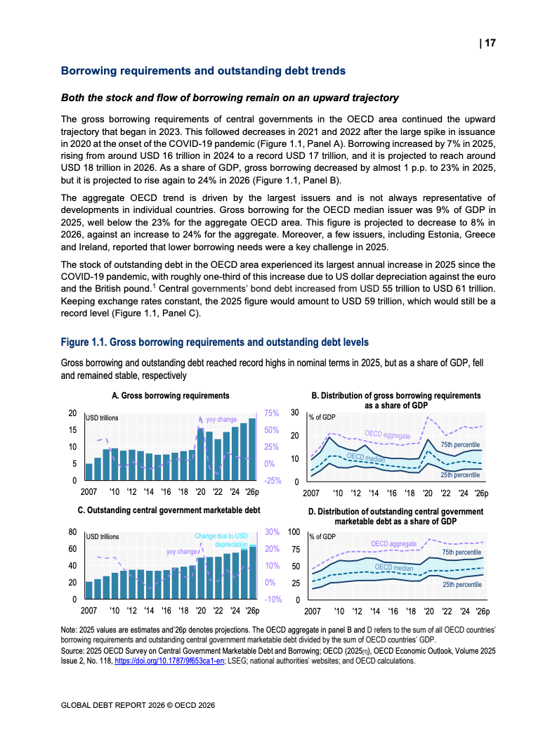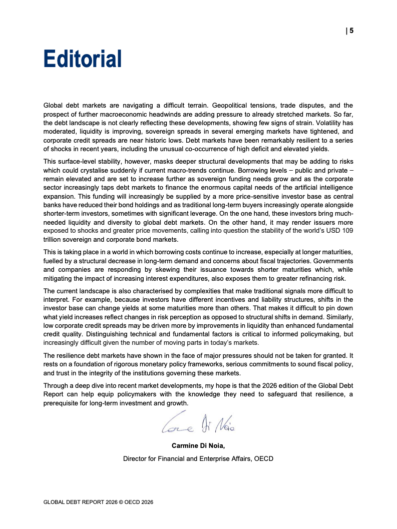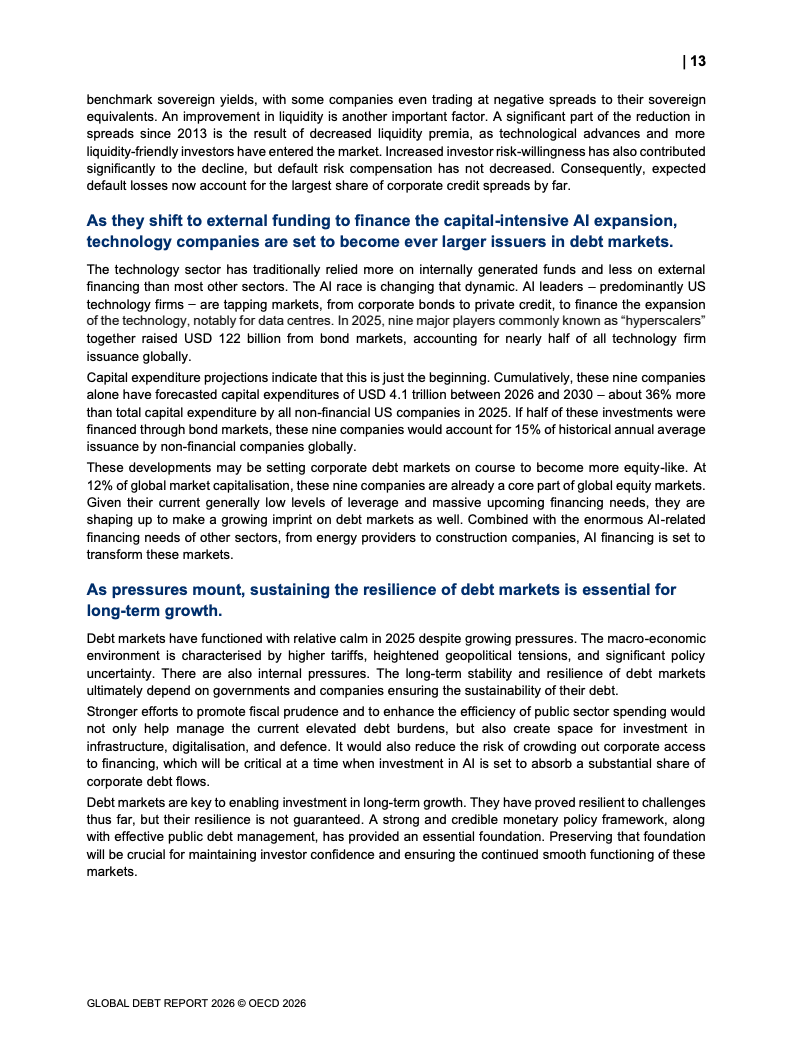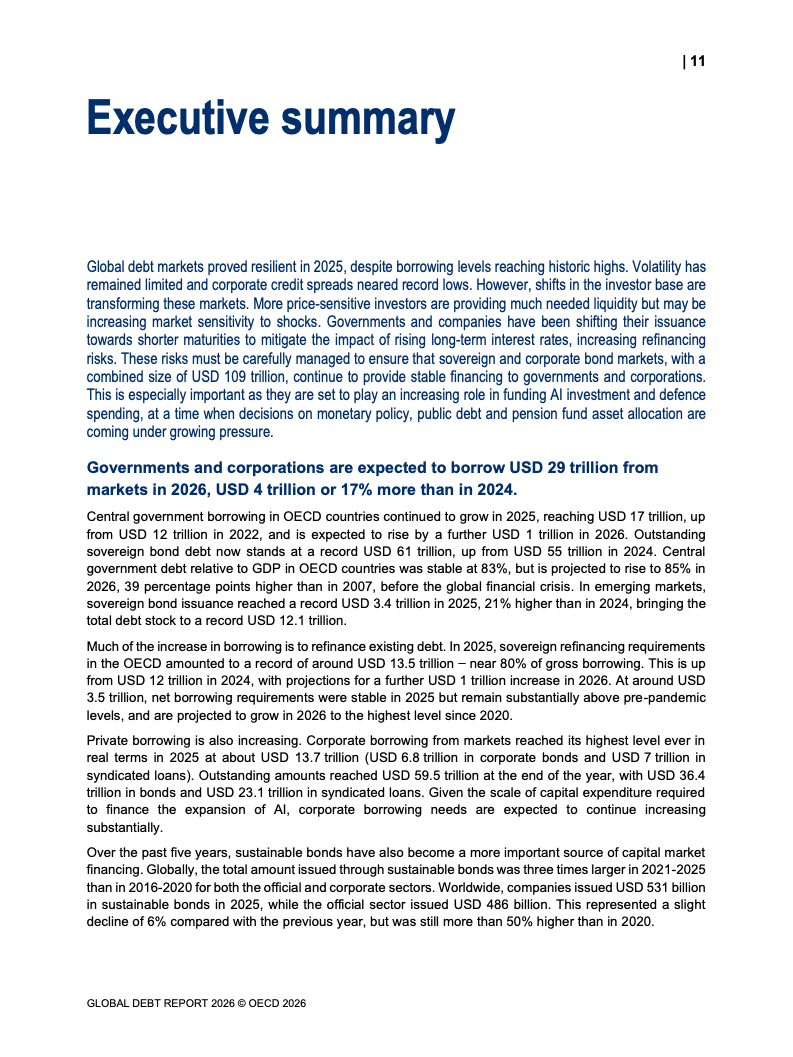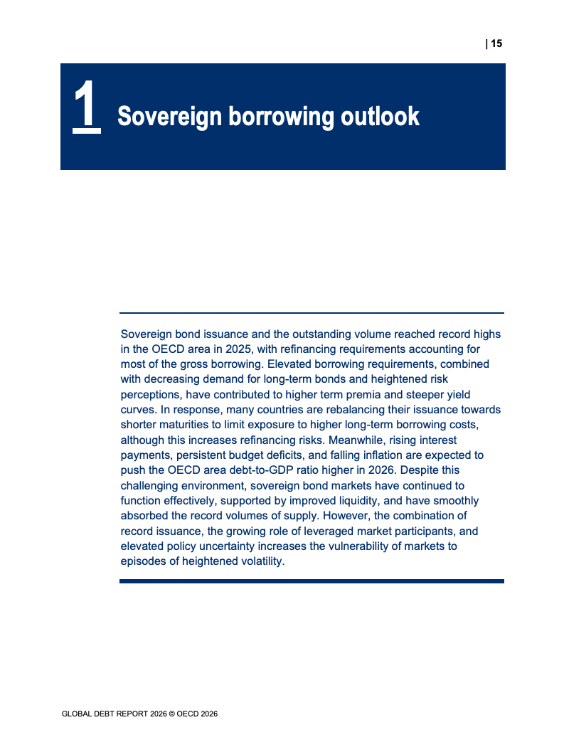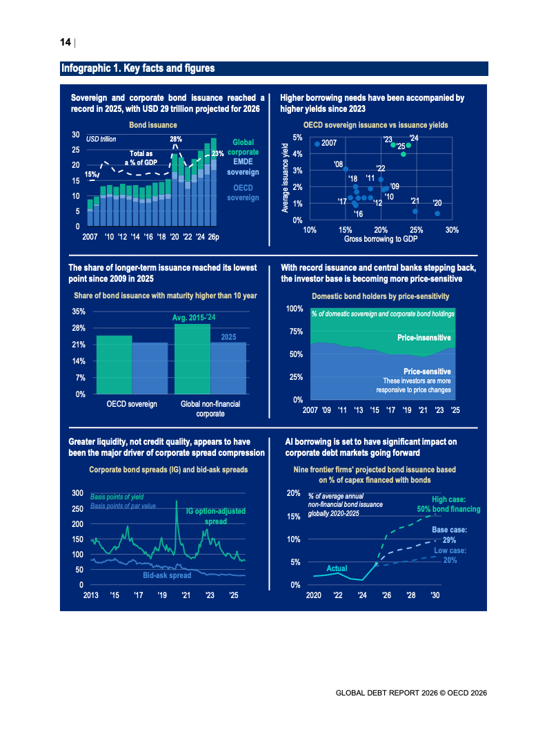 从融资规模看,2026年全球政府与企业预计融资29万亿美元,较2024年增长17%。其中,OECD国家政府借款规模从2022年的12万亿美元升至2025年的17万亿美元,2026年进一步增加。企业融资亦创历史新高,2025年达到13.7万亿美元,总存量达59.5万亿美元,显示债务驱动增长趋势持续强化。
