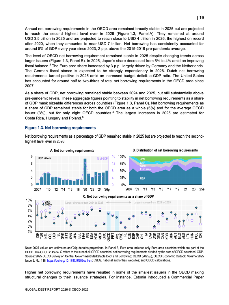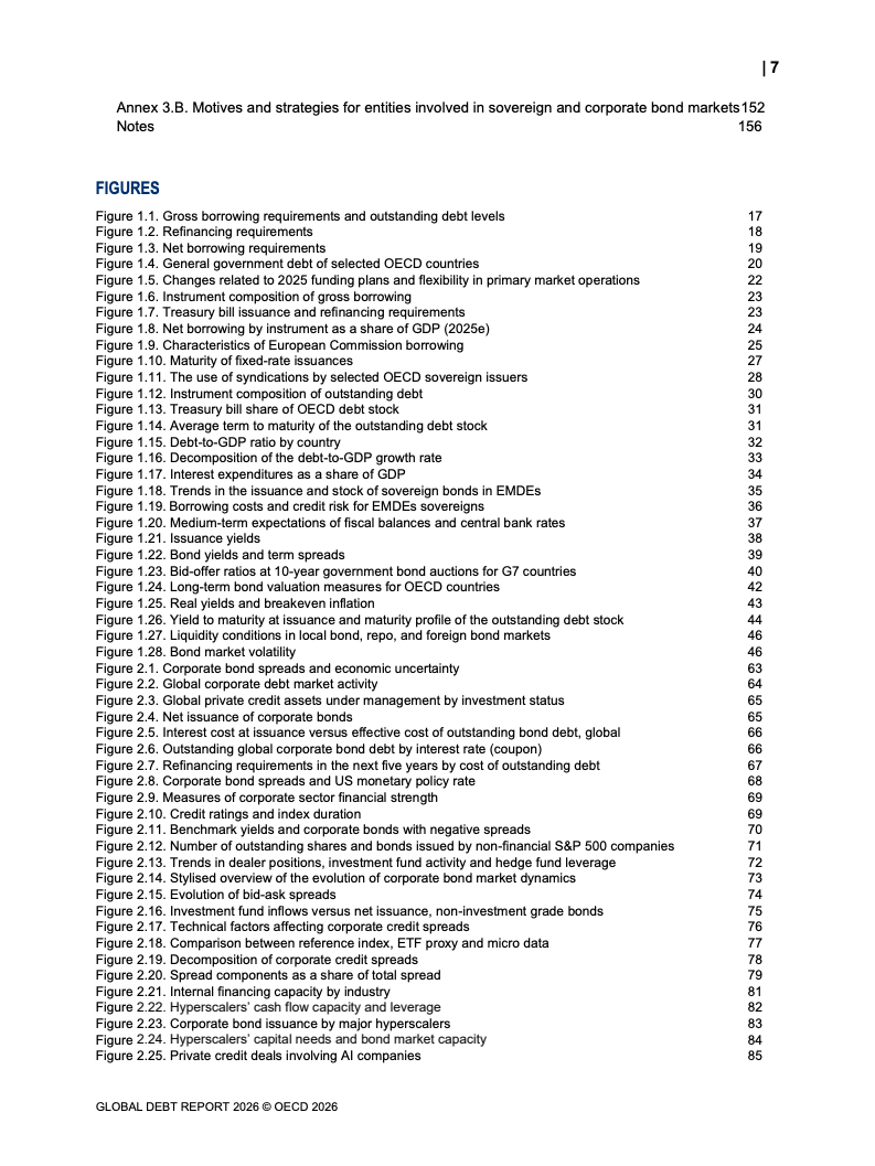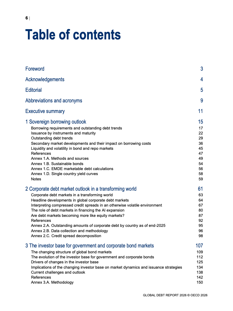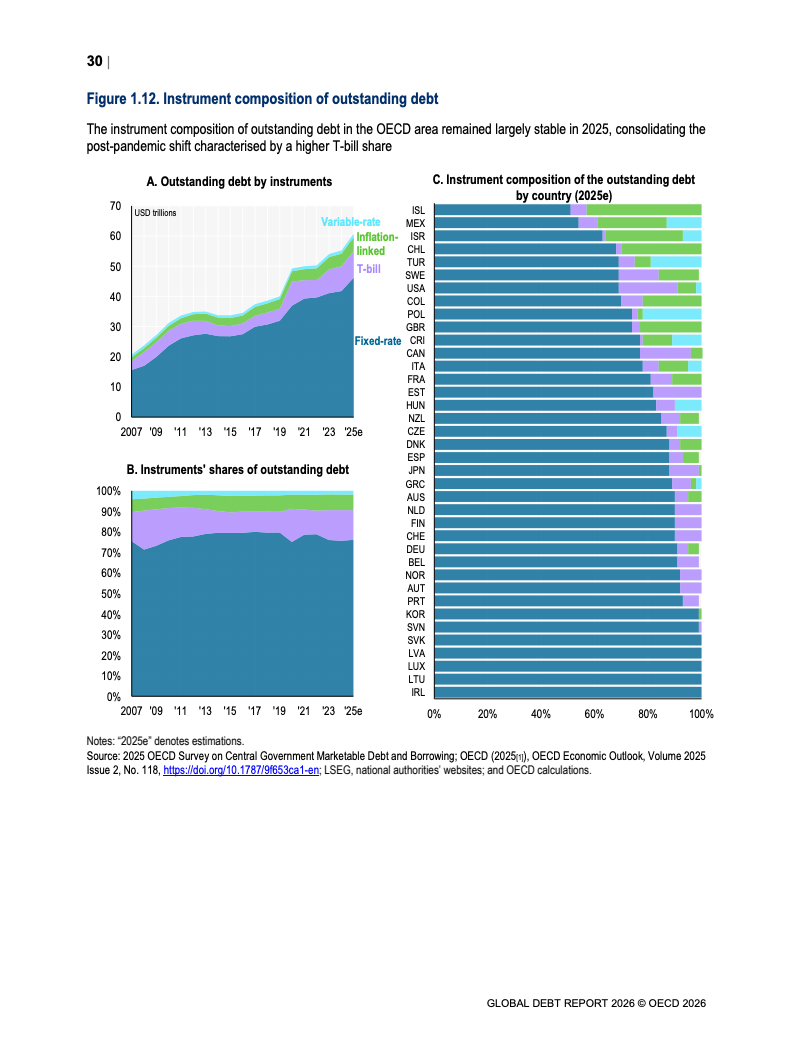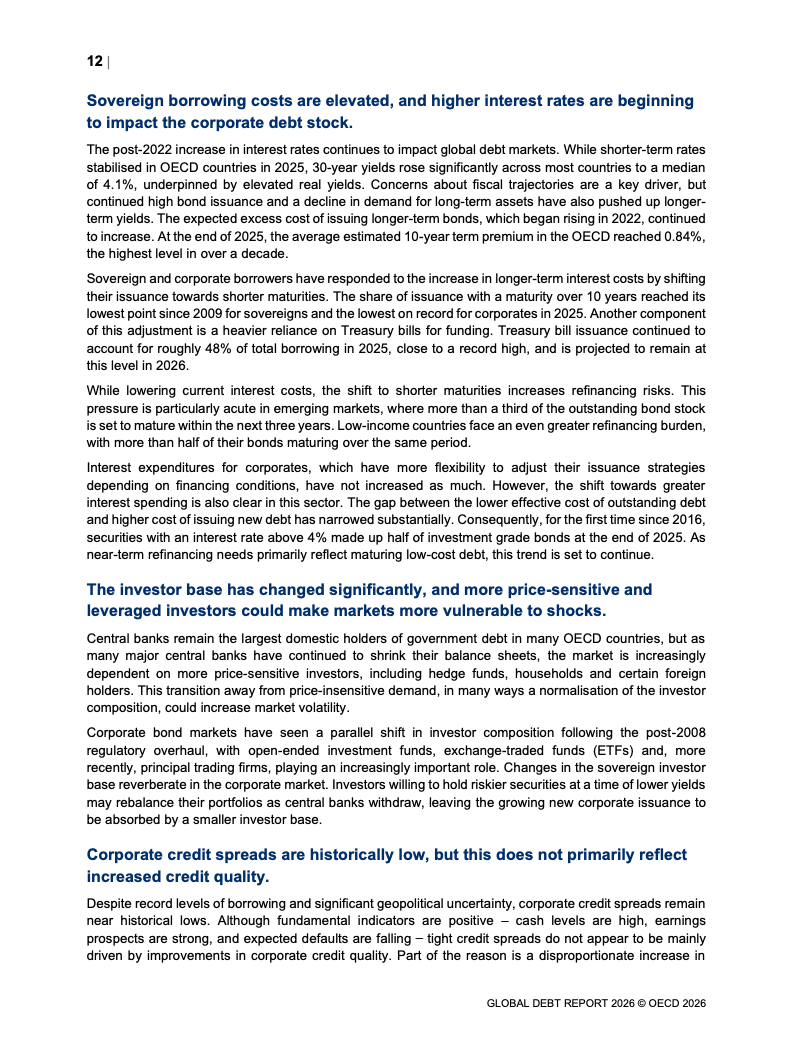 从融资规模看,2026年全球政府与企业预计融资29万亿美元,较2024年增长17%。其中,OECD国家政府借款规模从2022年的12万亿美元升至2025年的17万亿美元,2026年进一步增加。企业融资亦创历史新高,2025年达到13.7万亿美元,总存量达59.5万亿美元,显示债务驱动增长趋势持续强化。