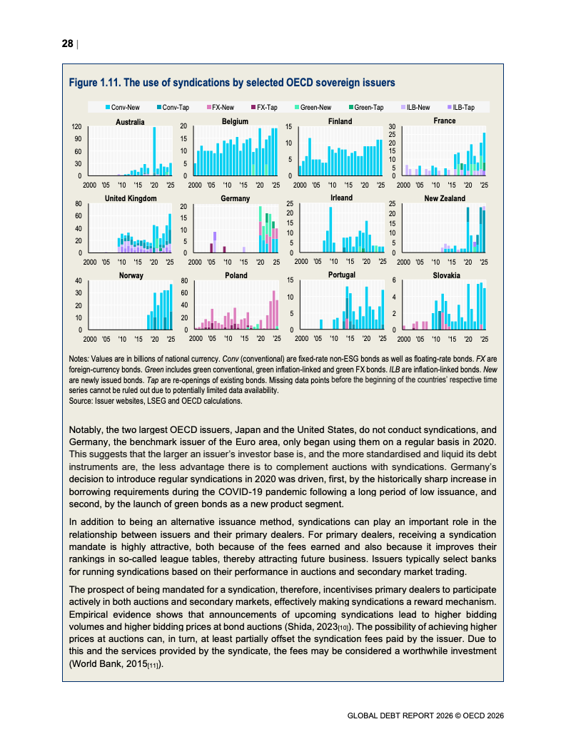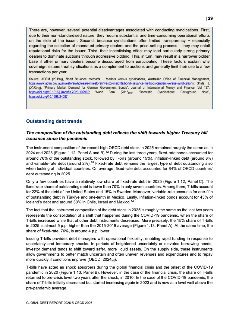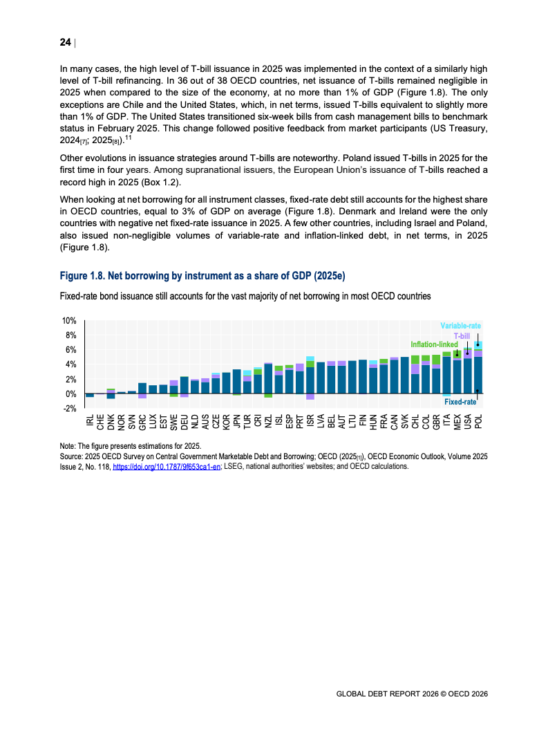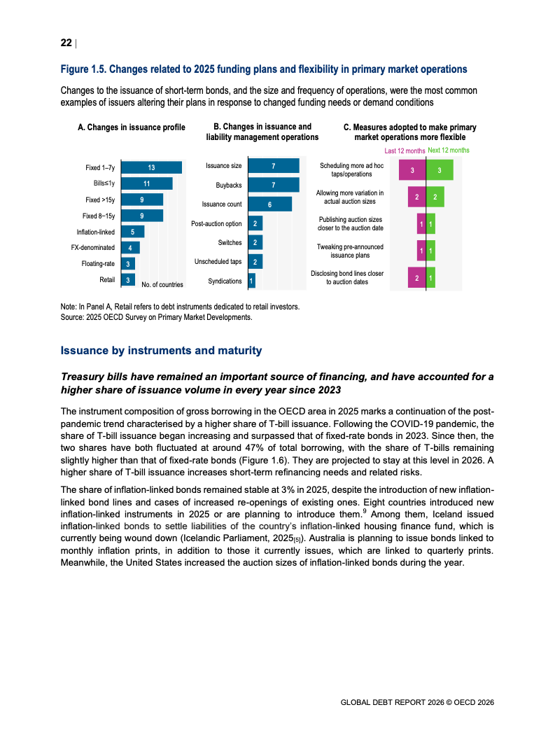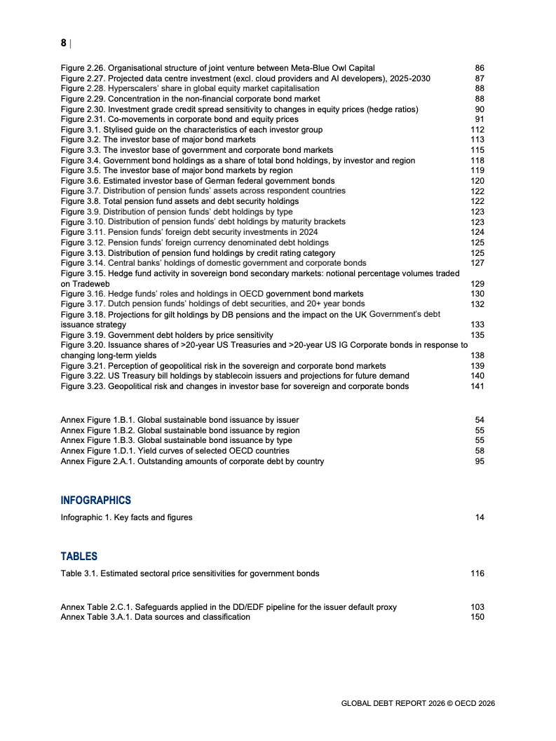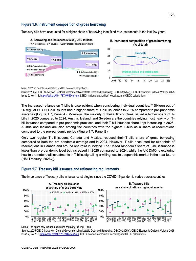 从融资规模看,2026年全球政府与企业预计融资29万亿美元,较2024年增长17%。其中,OECD国家政府借款规模从2022年的12万亿美元升至2025年的17万亿美元,2026年进一步增加。企业融资亦创历史新高,2025年达到13.7万亿美元,总存量达59.5万亿美元,显示债务驱动增长趋势持续强化。