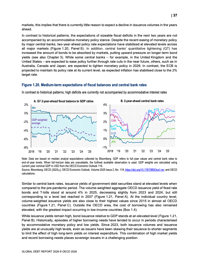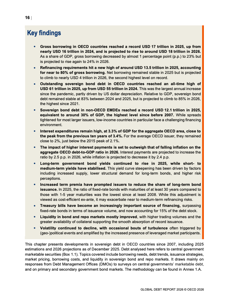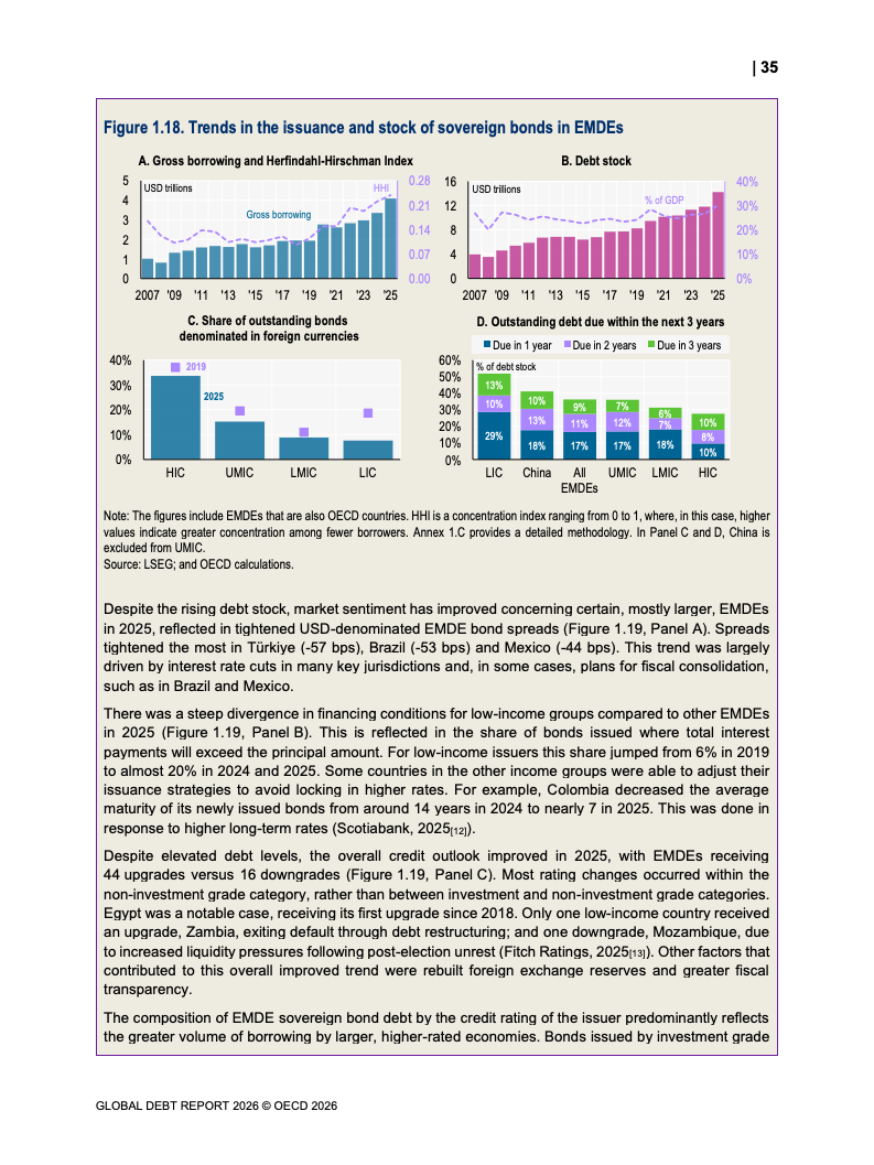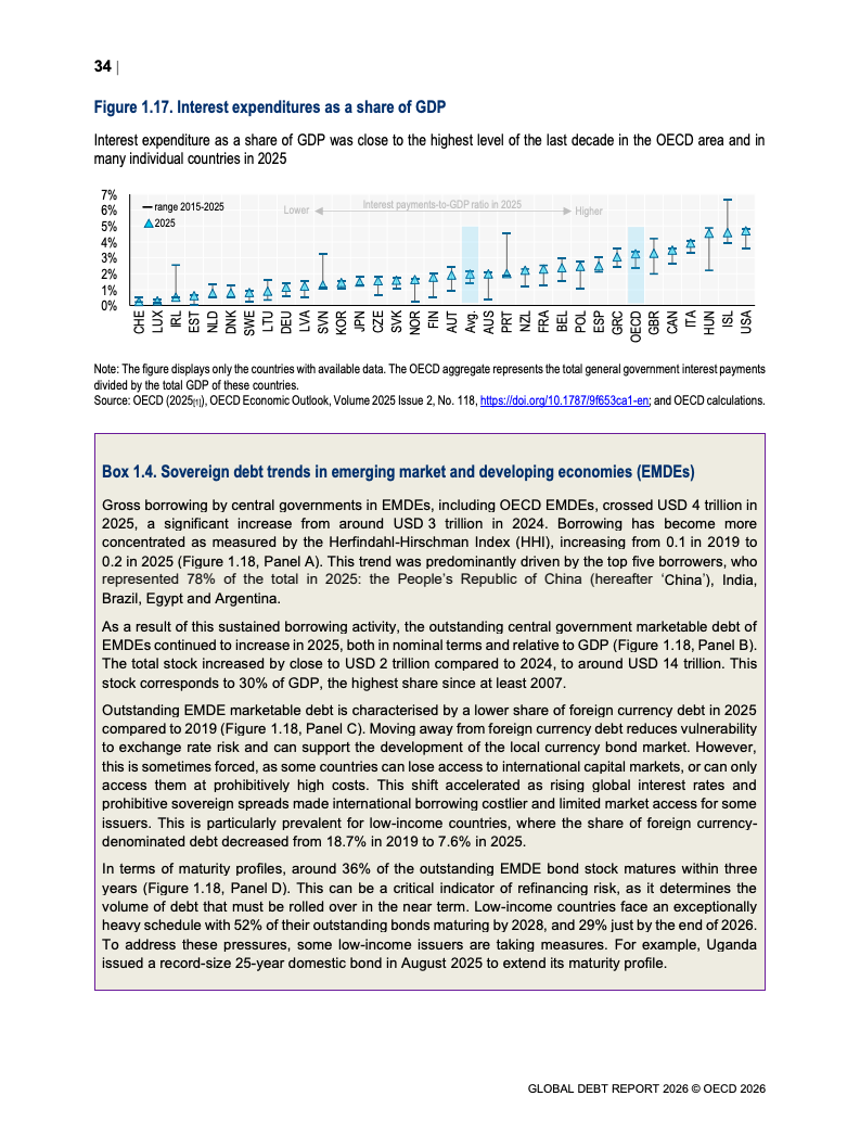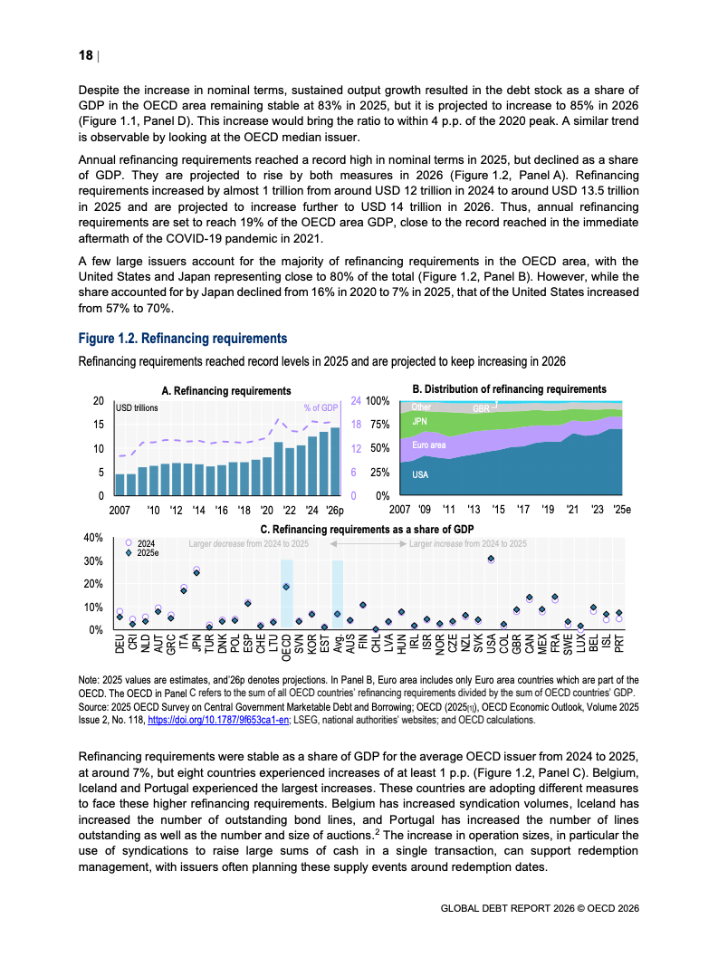 债务存量同步攀升。OECD国家主权债务已达61万亿美元,占GDP比重从2007年的约46%升至2026年预计的85%。新兴市场债务规模达到12.1万亿美元,同比显著增长。值得注意的是,债务扩张中约80%为再融资需求,2025年再融资规模达13.5万亿美元,凸显“借新还旧”的结构特征。