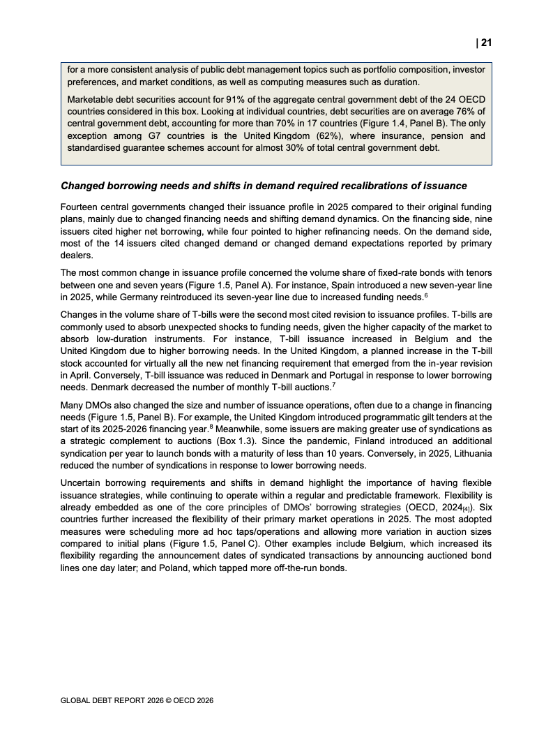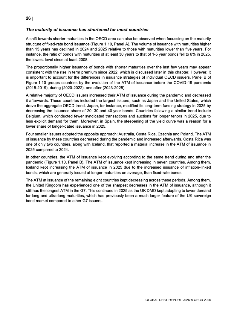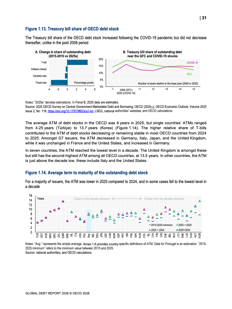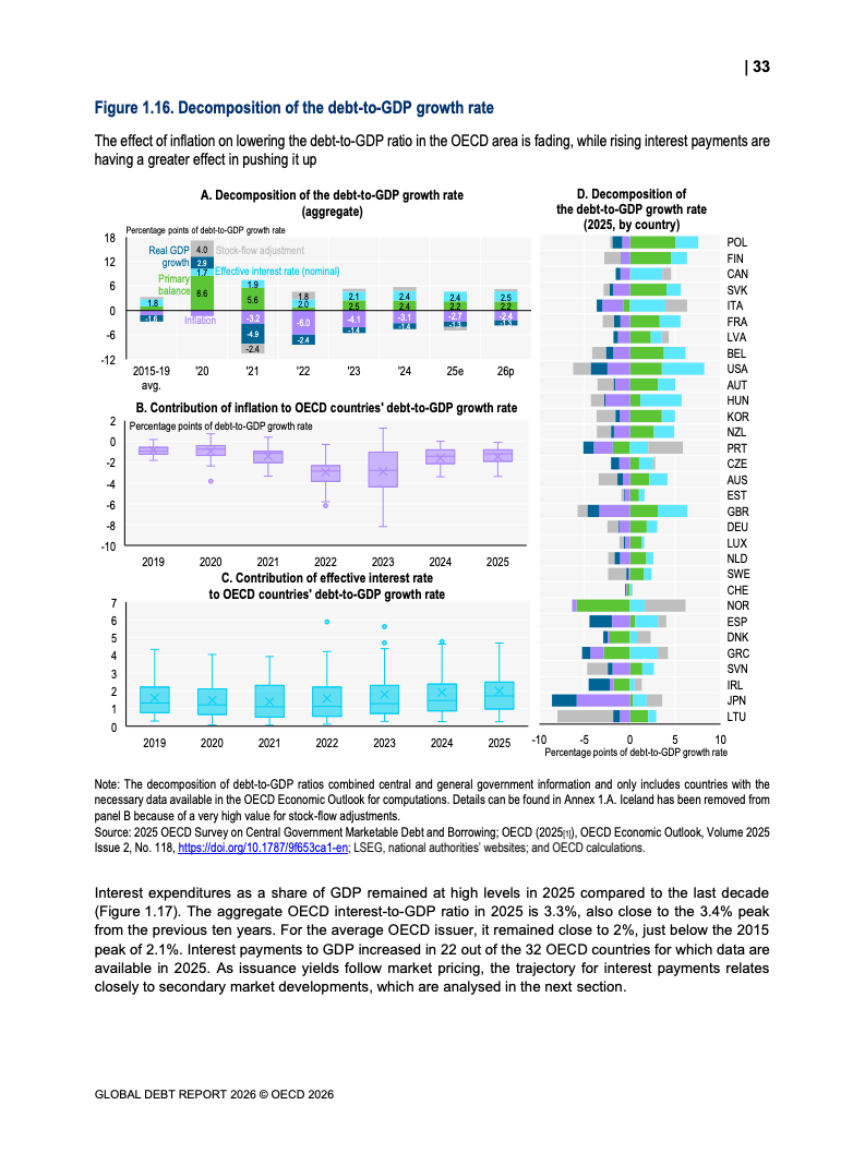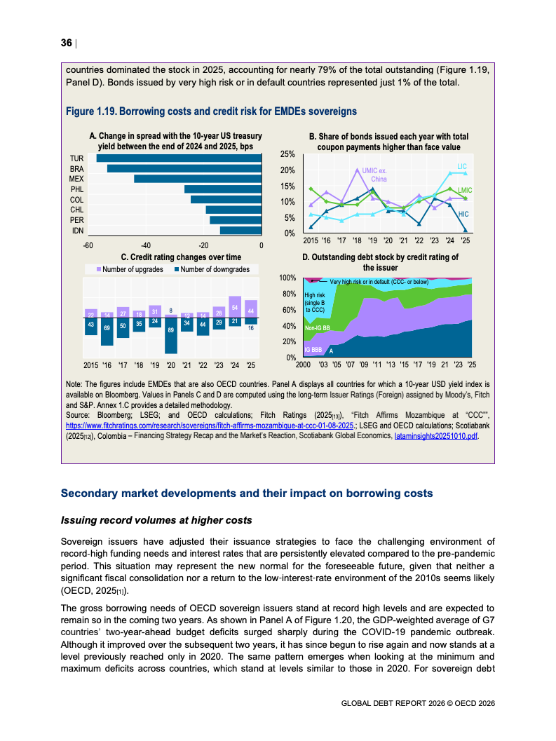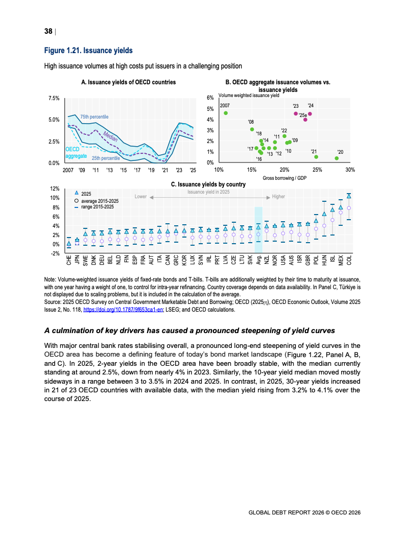 债务存量同步攀升。OECD国家主权债务已达61万亿美元,占GDP比重从2007年的约46%升至2026年预计的85%。新兴市场债务规模达到12.1万亿美元,同比显著增长。值得注意的是,债务扩张中约80%为再融资需求,2025年再融资规模达13.5万亿美元,凸显“借新还旧”的结构特征。