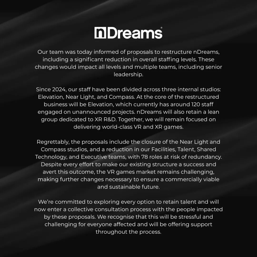 3月初,英国老牌VR游戏开发商兼发行商nDreams在其领英页面发布公告,宣布大幅削减员工规模,并关闭旗下Near Light和Compass两家内部工作室,共计78名开发人员受影响,其中包括部分高级管理岗位。