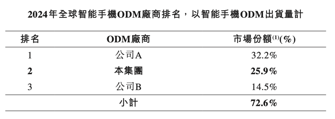 根据灼识咨询的数据,以2020—2024年智能手机ODM累计出货量计,华勤技术是全球第一大智能手机ODM厂商,市场份额达到了 25.9%,同一时间内,累计市场份额达25.2%,远超行业内其他竞争对手。
